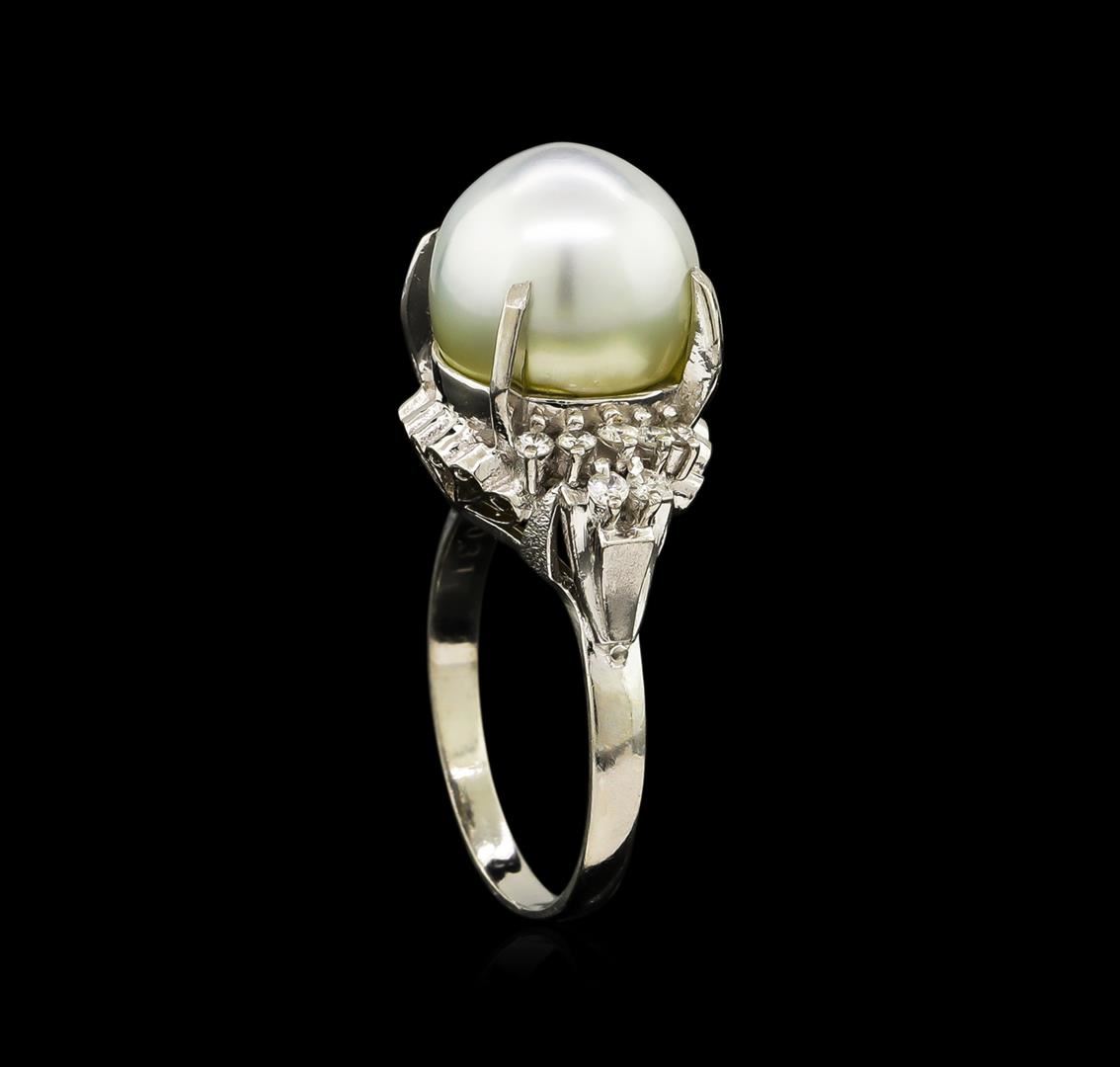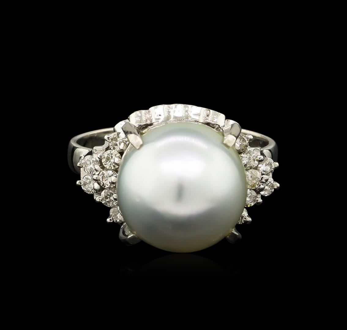 One electronically tested platinum lady's cast fashion ring with a bright polish finish. The featured ladies' ring has a shank measuring 2.25 millimeters in width. Identified with markings of "PT". Condition is like new, good workmanship. Containing: One akoya cultured pearl, 14.3mm in size to 11.9mm in size. The pearl is gray in color, very slightly gray overtone with a good luster, off round, and mostly clean. Fourteen prong set round brilliant cut diamonds, measuring 1.80 - 1.75 x 1.11mm (depth est.) approximate total weight of 14 Stones = 0.31ct. Graded in the setting. Clarity: SI-2 to I-1. Color: H - I. Cut Good. Total Weight of Diamonds 0.31ct. Total Weight of Ring 9.70gm. GAS Appraised at $3,400.00.