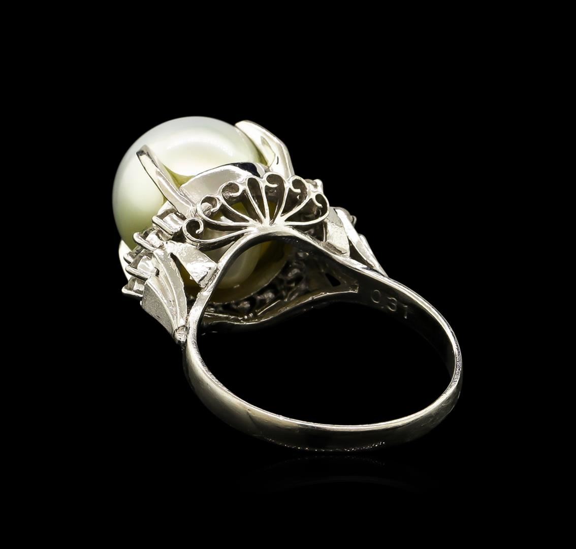 One electronically tested platinum lady's cast fashion ring with a bright polish finish. The featured ladies' ring has a shank measuring 2.25 millimeters in width. Identified with markings of "PT". Condition is like new, good workmanship. Containing: One akoya cultured pearl, 14.3mm in size to 11.9mm in size. The pearl is gray in color, very slightly gray overtone with a good luster, off round, and mostly clean. Fourteen prong set round brilliant cut diamonds, measuring 1.80 - 1.75 x 1.11mm (depth est.) approximate total weight of 14 Stones = 0.31ct. Graded in the setting. Clarity: SI-2 to I-1. Color: H - I. Cut Good. Total Weight of Diamonds 0.31ct. Total Weight of Ring 9.70gm. GAS Appraised at $3,400.00.