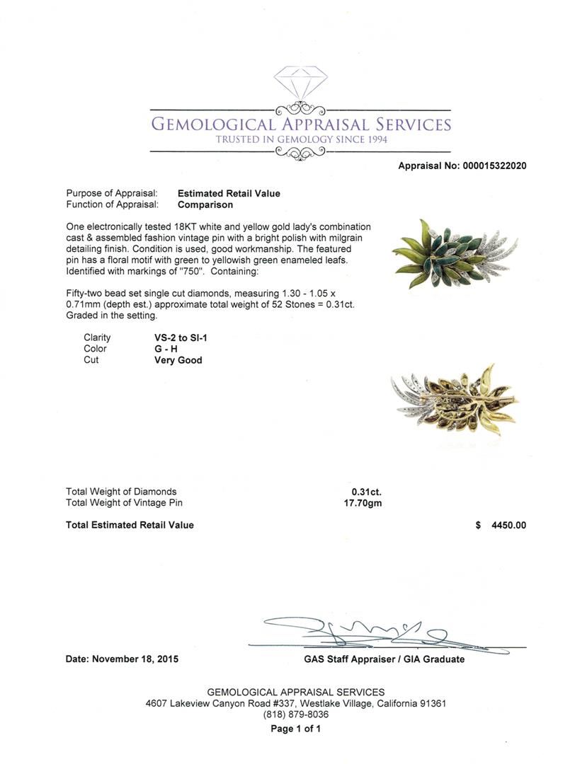 One electronically tested 18KT white and yellow gold lady's combination cast & assembled fashion vintage pin with a bright polish with milgrain detailing finish. The featured pin has a floral motif with green to yellowish green enameled leafs. Identified with markings of "750". Condition is used, good workmanship. Containing: Fifty-Two bead set single cut diamonds, measuring 1.30 - 1.05 x 0.71mm (depth est.) approximate. Total Weight of 52 Stones = 0.31ct. Graded in the setting. Clarity: VS-2 to SI-1. Color: G - Very Good. Total Weight of Diamonds 0.31ct. Total Weight of Vintage Pin 17.70gm. GAS Appraised.