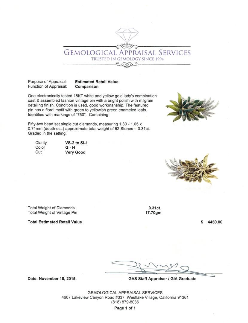 One electronically tested 18KT white and yellow gold lady's combination cast & assembled fashion vintage pin with a bright polish with milgrain detailing finish. The featured pin has a floral motif with green to yellowish green enameled leafs. Identified with markings of "750". Condition is used, good workmanship. Containing: Fifty-Two bead set single cut diamonds, measuring 1.30 - 1.05 x 0.71mm (depth est.) approximate. Total Weight of 52 Stones = 0.31ct. Graded in the setting. Clarity: VS-2 to SI-1. Color: G - Very Good. Total Weight of Diamonds 0.31ct. Total Weight of Vintage Pin 17.70gm. GAS Appraised.