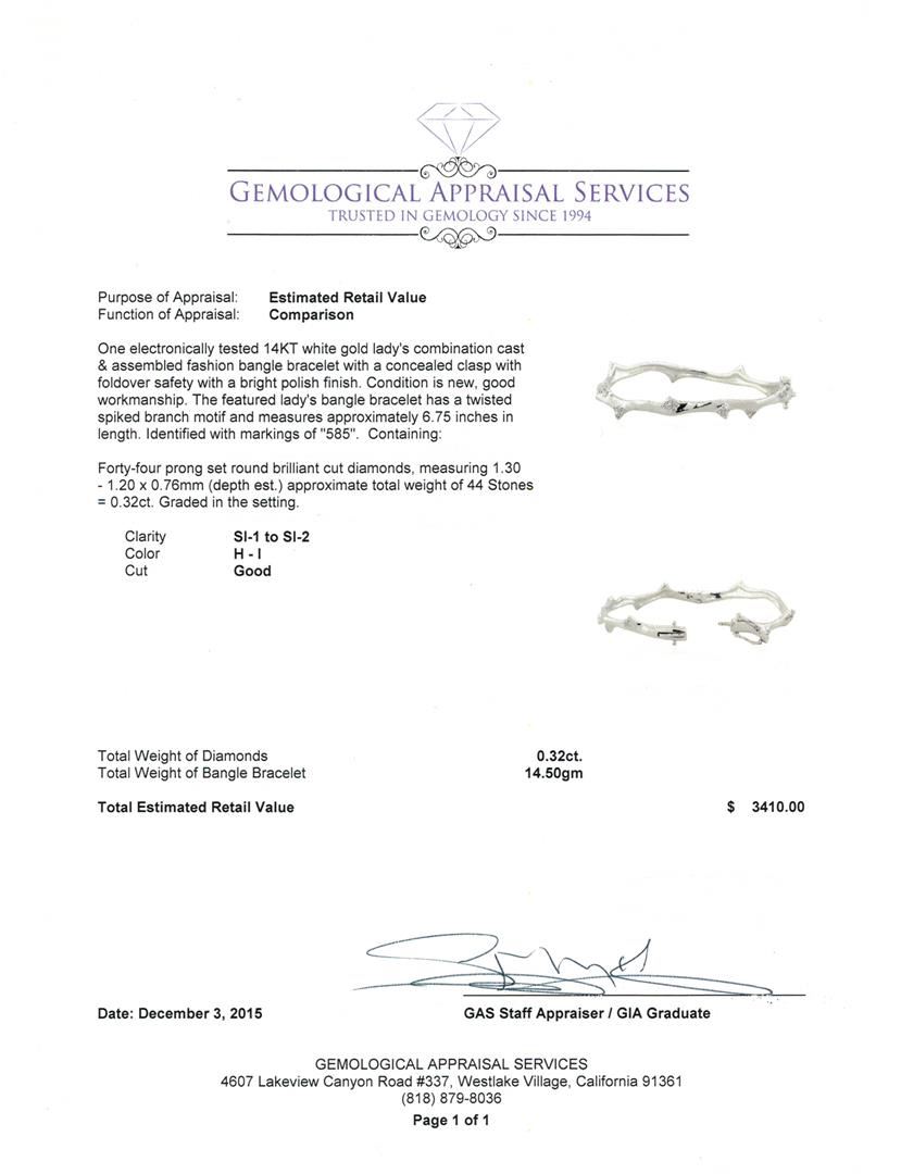 One electronically tested 14KT white gold lady's combination cast & assembled fashion bangle bracelet with a concealed clasp with foldover safety with a bright polish finish. The featured lady's bangle bracelet has a twisted spiked branch motif and measures approximately 6.75 inches in length. Identified with markings of "585". Condition is new, good workmanship. Containing: Forty-Four prong set round brilliant cut diamonds, measuring 1.30 - 1.20 x 0.76mm (depth est.) approximate total weight of 44 Stones = 0.32ct. Graded in the setting. Clarity: SI-1 to SI-2. Color: H - I. Cut Good. Total Weight of Diamonds 0.32ct. Total Weight of Bangle Bracelet 14.50gm. GAS Appraised.