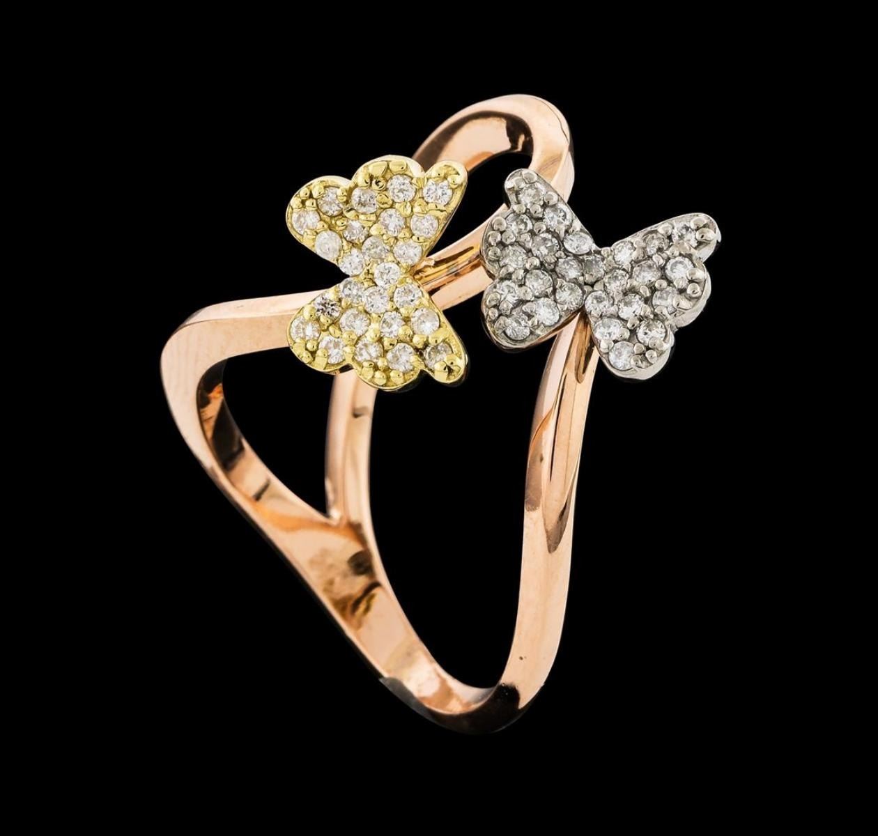 One Diamond Ring featuring: 14KT Tri-Tone Gold with a total weight of 4.30 grams and 50 Diamonds with a total weight of 0.32ctw.