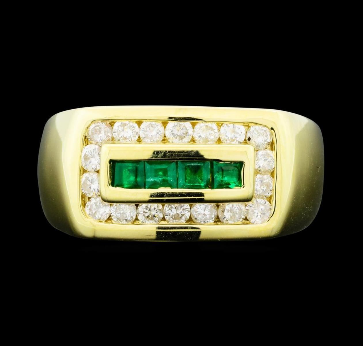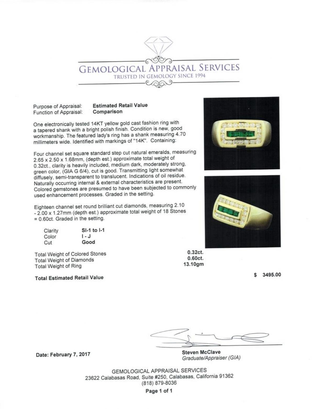 One electronically tested 14KT yellow gold cast fashion ring with a tapered shank with a bright polish finish. The featured lady's ring has a shank measuring 4.70 millimeters wide. Identified with markings of '14K'. Condition is new, good workmanship. Containing: Four channel set square standard step cut natural emeralds, measuring 2.65 x 2.50 x 1.68mm, (depth est.) approximate total weight of 0.32ct., clarity is heavily included, medium dark, moderately strong, green color, (GIA G 6/4), cut is good. Transmitting light somewhat diffusely, semi-transparent to translucent. Indications of oil residue. Naturally occurring internal & external characteristics are present. Colored gemstones are presumed to have been subjected to commonly used enhancement processes. Graded in the setting. Eighteen channel set round brilliant cut diamonds, measuring 2.10 - 2.00 x 1.27mm (depth est.) approximate total weight of 18 Stones = 0.60ct. Graded in the setting. Clarity SI-1 to I-1. Color: I - J Cut Good. Total Weight of Colored Stones 0.32ct.. Total Weight of Diamonds 0.60ct.. Total Weight of Ring 13.10gm GAS Appraised.