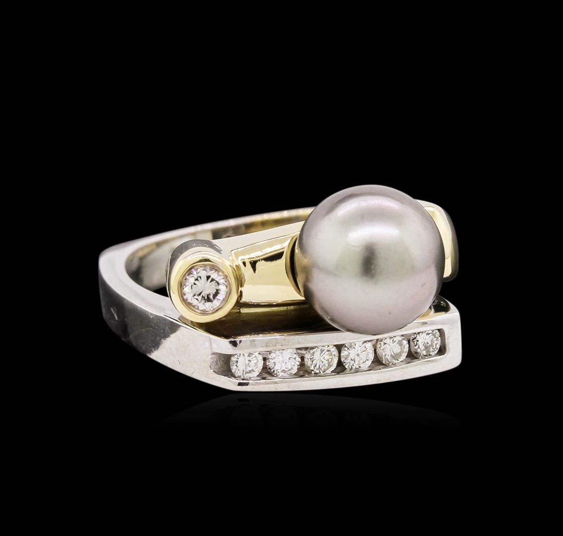 One electronically tested 14KT white and yellow gold lady's cast fashion ring with a bypass shank with a bright polish finish. The featured lady's ring has a shank measuring 3.41 millimeters wide. Identified with markings of "14K". Condition is new, good workmanship. Containing: One Tahitian pearl, 8.4mm in size to 8.4mm in size. The pearl is black in color, green overtone with a very good luster, round, and clean. One bezel set round brilliant cut diamond, measuring 2.90 - 2.85 x 1.81mm (depth est.) approximate weight of 0.09ct. Graded in the setting. Clarity: VS-2. Color: Good Six channel set round brilliant cut diamonds, measuring 2.20 - 2.10 x 1.33mm (depth est.) approximate total weight of 6 Stones = 0.23ct. Graded in the setting. Clarity: VS-2 to SI-1. Color: H - I. Cut Good. Total Weight of Diamonds 0.32ct. Total Weight of Ring 8.80gm. GAS Appraised at $2,700.00.