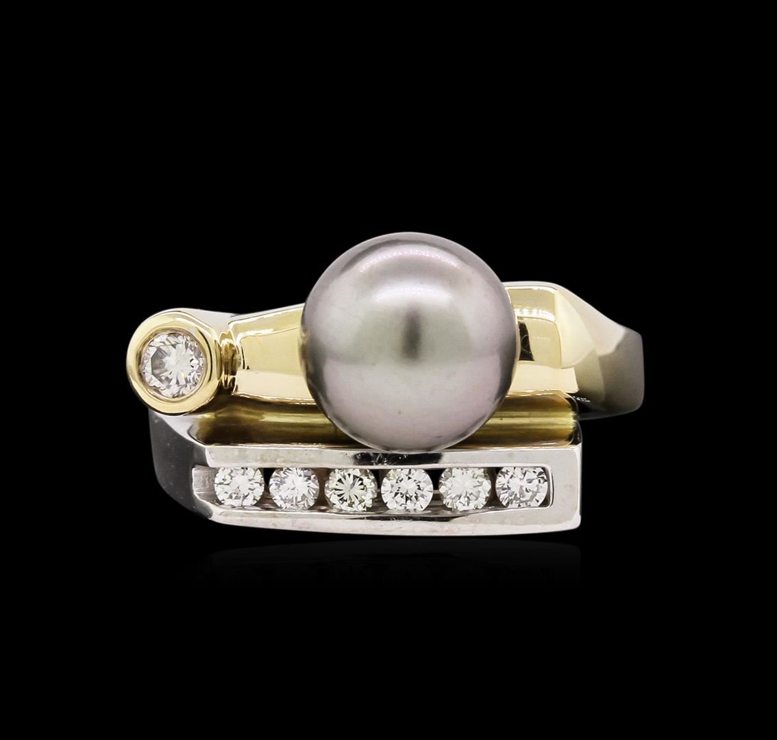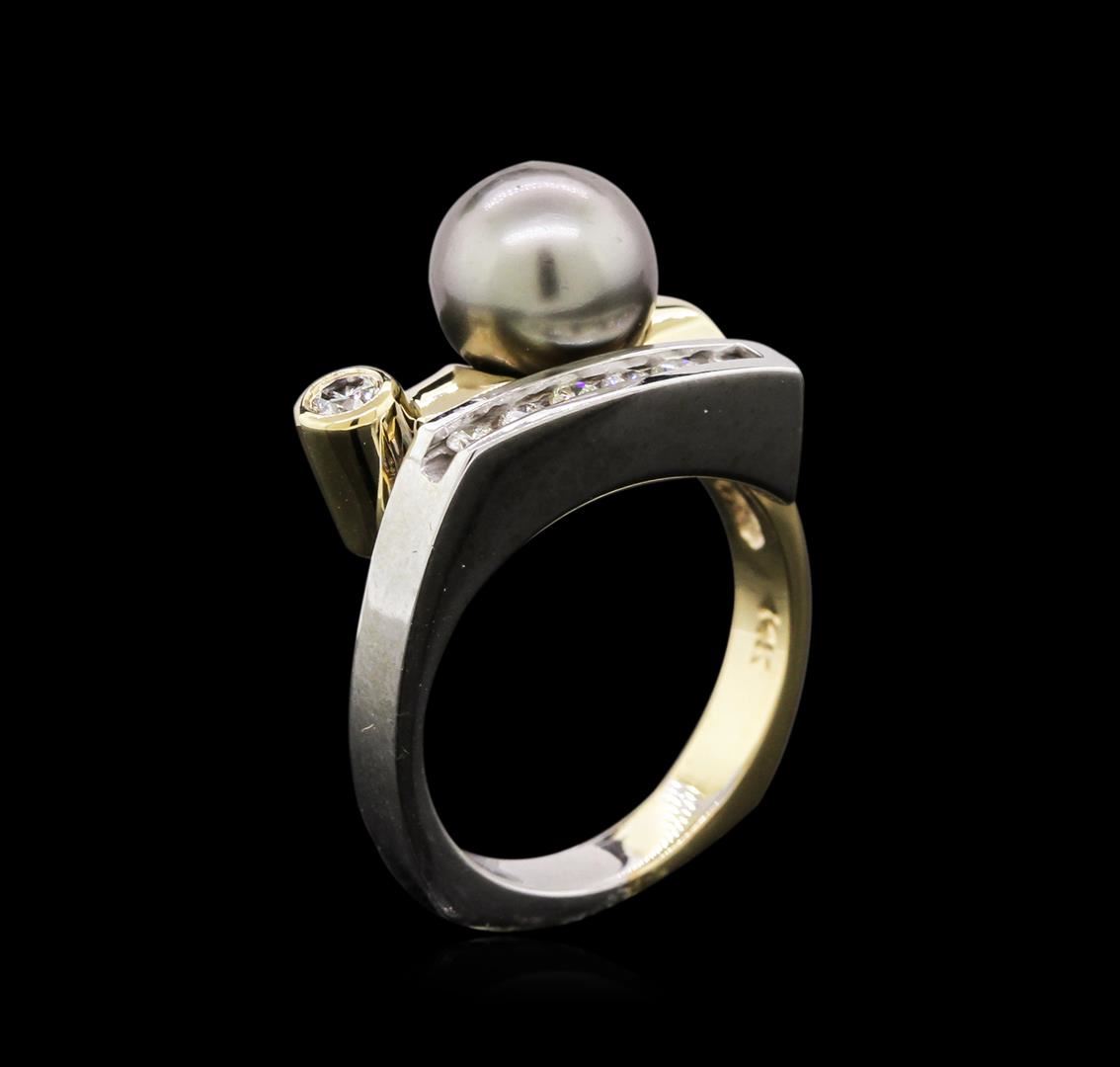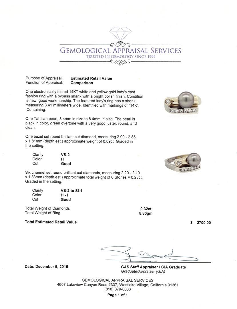 One electronically tested 14KT white and yellow gold lady's cast fashion ring with a bypass shank with a bright polish finish. The featured lady's ring has a shank measuring 3.41 millimeters wide. Identified with markings of "14K". Condition is new, good workmanship. Containing: One Tahitian pearl, 8.4mm in size to 8.4mm in size. The pearl is black in color, green overtone with a very good luster, round, and clean. One bezel set round brilliant cut diamond, measuring 2.90 - 2.85 x 1.81mm (depth est.) approximate weight of 0.09ct. Graded in the setting. Clarity: VS-2. Color: Good Six channel set round brilliant cut diamonds, measuring 2.20 - 2.10 x 1.33mm (depth est.) approximate total weight of 6 Stones = 0.23ct. Graded in the setting. Clarity: VS-2 to SI-1. Color: H - I. Cut Good. Total Weight of Diamonds 0.32ct. Total Weight of Ring 8.80gm. GAS Appraised at $2,700.00.