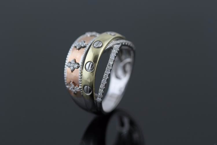 0.32ctw Statement Diamond Ring 14k Two Tone |Shape:Round 1.3|Stone Count:44|Carat Weight:0.32|Color:G-H|Clarity: Si2-Si3|Shape: |MM Size:|Diamond Count:|Carat Weight:|Color:|Clarity:|Band Width:3.8|Ring Face Dimension(mm):12.8|Ring Height:4.3|Ring Size:6.5|Gram Weight:5.99