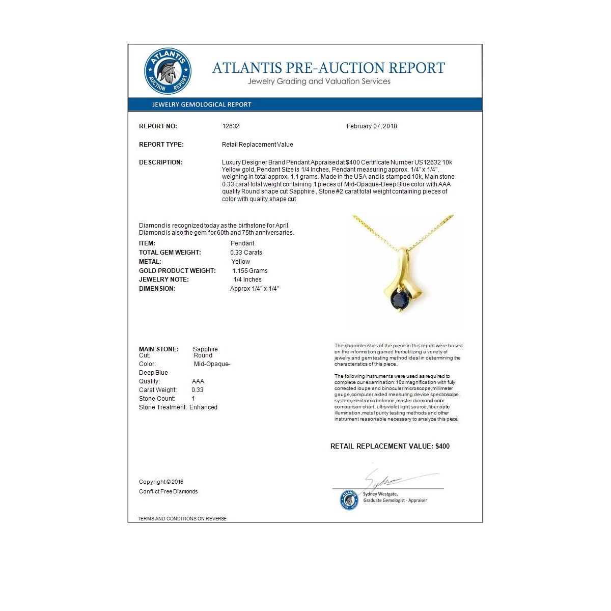 REF-7W3F -12632 ---- 0.33 CTW Blue Sapphire Pendant 10K Yellow Gold ---- Luxury Designer Brand Pendant Appraised at $400 Certificate Number US12632 10k Yellow gold, Pendant Size is 1/4 Inches, Pendant measuring approx. 1/4" x 1/4", weighing in total approx. 1.1 grams. Made in the USA and is stamped 10k, Main stone 0.33 carat total weight containing 1 pieces of Mid-Opaque-Deep Blue color with AAA quality Round shape cut Sapphire , Stone #2 carat total weight containing pieces of color with quality shape cut