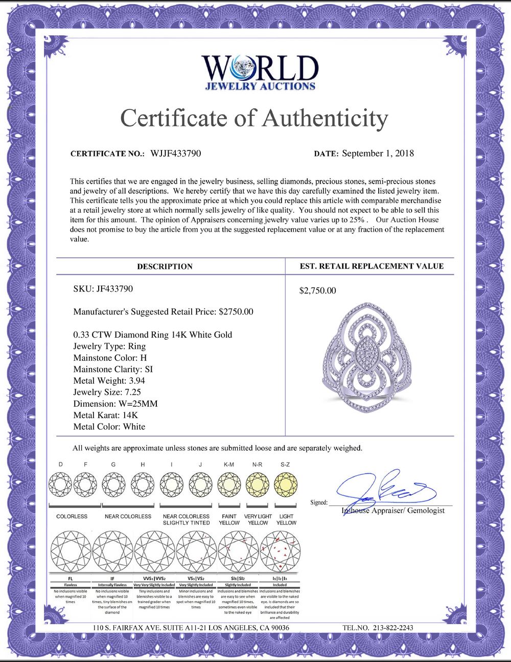 WORLD JEWELRY AUCTION believes to the best of its knowledge that the information presented in any listing has come from reliable sources. Such information is presented solely for the convenience of the Purchaser. WJA makes no warranties of any kind related to the information presented in any listing. WJA further makes no warranties, either express or implied, relating to the value, marketability or condition of the lot described in any listing. Prospective bidders should investigate a lot thoroughly before bidding. By bidding the Bidder acknowledges that Bidder has investigated the lot to his or her satisfaction, or, that Bidder has chosen not to do so, and agrees to accept the lot being bid on with no objections after the sale closes. If you are uncertain please contact us with your questions prior to bidding. If you are still uncertain after we reply, please refrain from bidding. Photos other graphic material contained in any listing of generic or duplicate lots may be stock presentations and not necessarily of the specific lot.