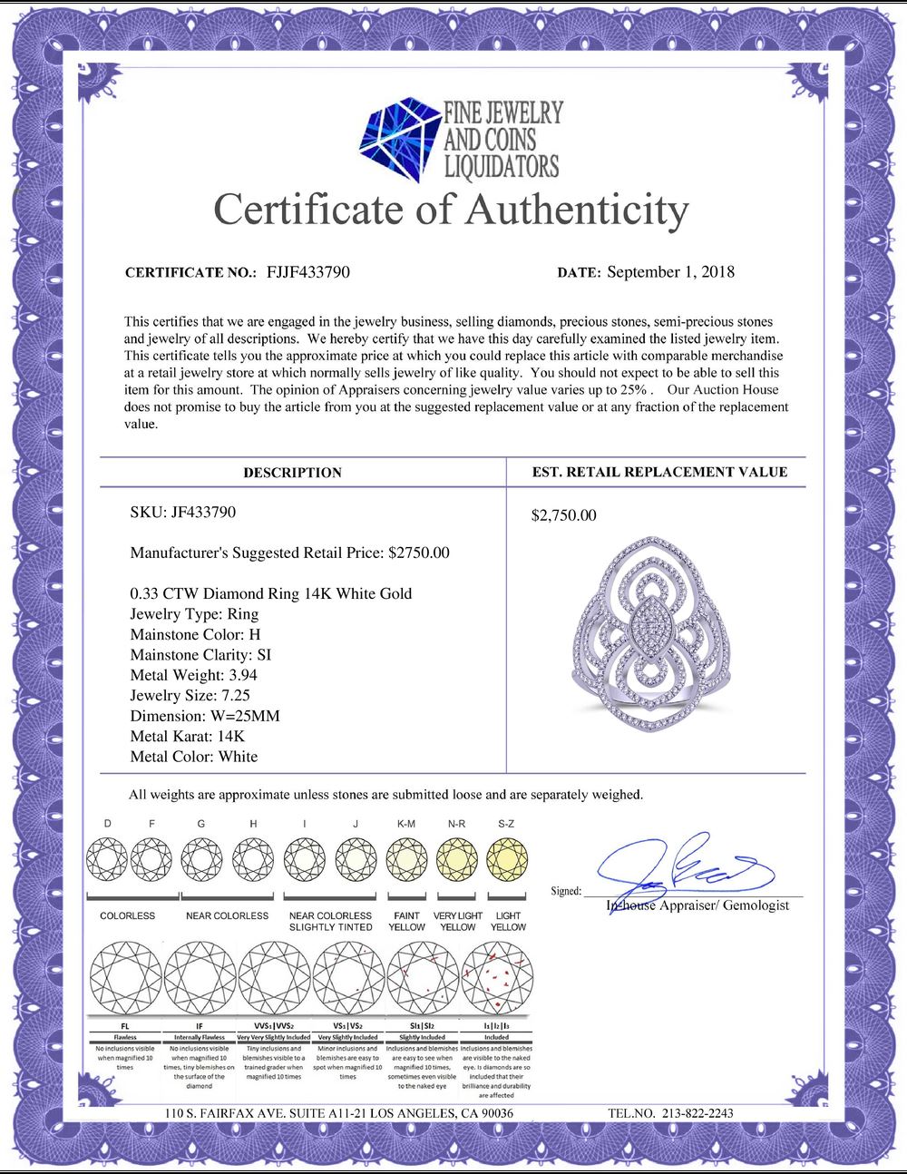 All property is sold “AS IS”, and ALL SALES ARE FINAL. Property is open to thorough public inspection. It is the Bidder’s responsibility to determine condition, age, genuineness, value or any other determinative factor. WJA may attempt to describe the merchandise in advertising and on the Internet but makes no representations. In no event shall WORLD JEWELRY AUCTION be held responsible for having made or implied any warranty of merchantability or fitness for a particular purpose. Bidder shall be the sole judge of value.