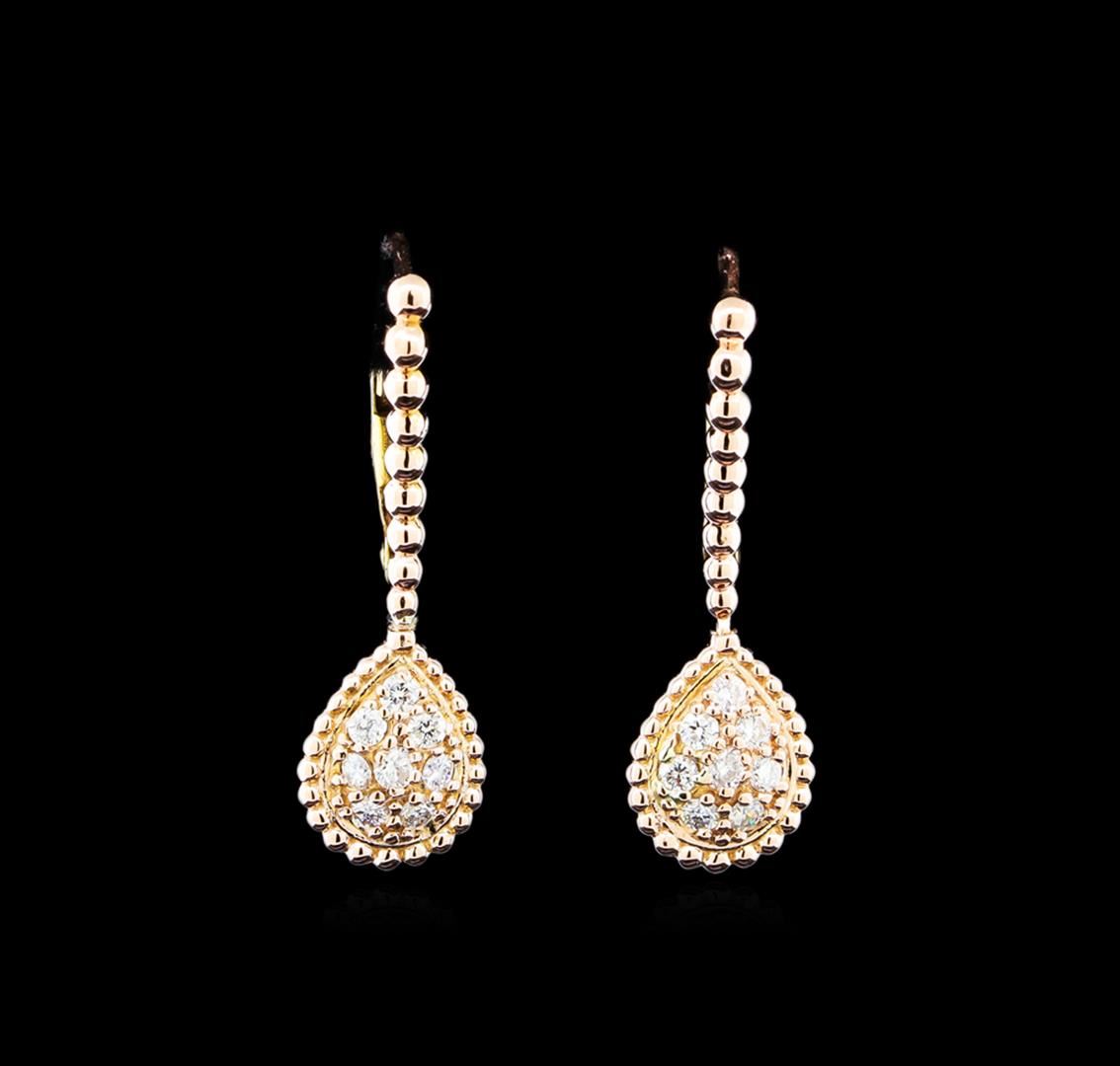 One pair of earrings featuring: 14KT rose gold weighing 3.38 grams containing diamonds weighing 0.33ctw.