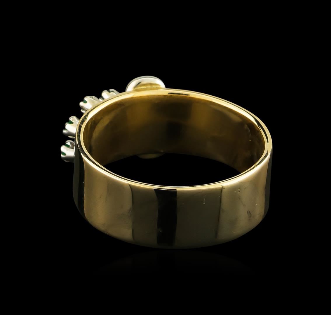 One ring featuring: 14KT rose gold weighing approximately 7.35 grams containing one center diamond with a total weight of 0.32ct, emeralds with a total weight of 0.25ct, and side diamonds with a total weight of 0.02ct.