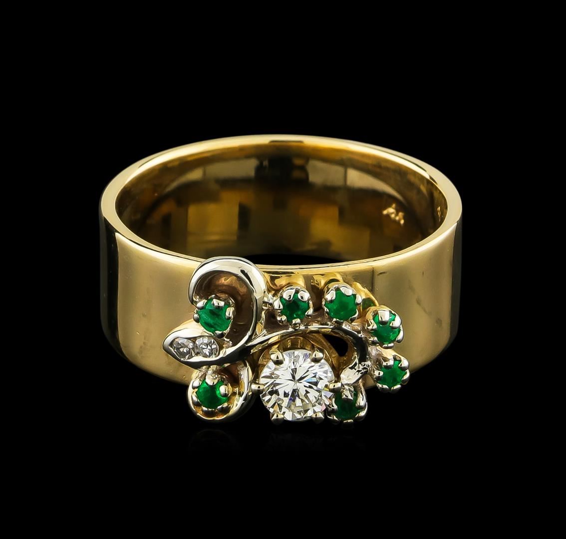 One ring featuring: 14KT rose gold weighing approximately 7.35 grams containing one center diamond with a total weight of 0.32ct, emeralds with a total weight of 0.25ct, and side diamonds with a total weight of 0.02ct.
