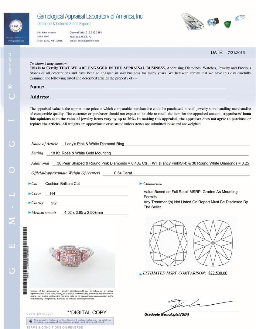 One Lady's Pink and White Diamond Ring. Setting: 18 Kt. Rose and White Gold Mounting. Additional: 38 Pear Shaped and Round Pink Diamonds = 0.40 Cts. TWT (Fancy Pink/SI-I) and 30 Round White Diamonds = 0.25 Cts. Center Gem Stone Information: Weight: 0.34 Carats. Cut: Cushion Brilliant Cut. Color: H-I. Clarity: SI2. Measurements: 4.02 x 3.65 x 2.50 mm. Total Weight: 3.53 grams.