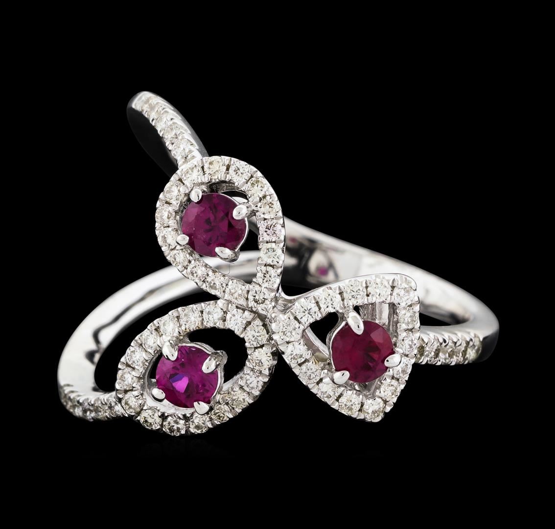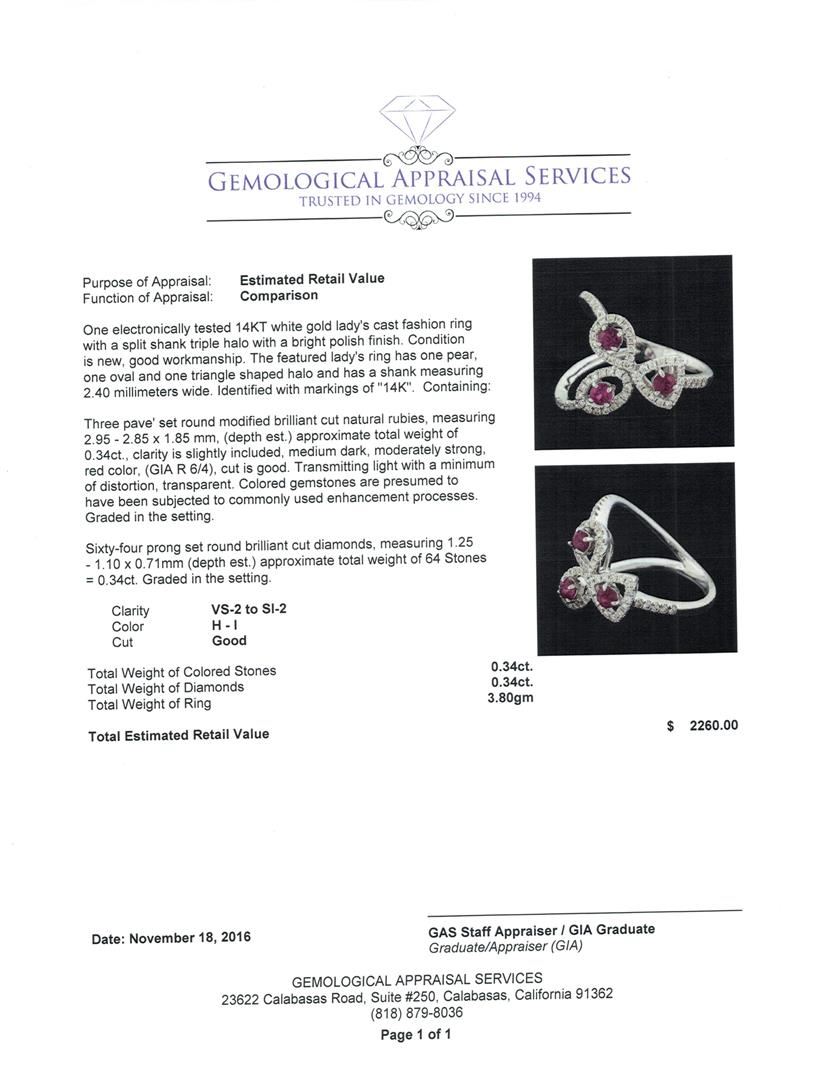 One electronically tested 14KT white gold lady's cast fashion ring with a split shank triple halo with a bright polish finish. The featured lady's ring has one pear, one oval and one triangle shaped halo and has a shank measuring 2.40 millimeters wide. Identified with markings of '14K'. Condition is new, good workmanship. Containing: Three pave' set round modified brilliant cut natural rubies, measuring 2.95 - 2.85 x 1.85 mm, (depth est.) approximate total weight of 0.34ct., clarity is slightly included, medium dark, moderately strong, red color, (GIA R 6/4), cut is good. Transmitting light with a minimum of distortion, transparent. Colored gemstones are presumed to have been subjected to commonly used enhancement processes. Graded in the setting. Sixty-Four prong set round brilliant cut diamonds, measuring 1.25 - 1.10 x 0.71mm (depth est.) approximate total weight of 64 Stones = 0.34ct. Graded in the setting. Clarity VS-2 to SI-2. Color: H - I Cut Good. Total Weight of Colored Stones 0.34ct.. Total Weight of Diamonds 0.34ct.. Total Weight of Ring 3.80gm. GAS Appraised at $2,260.00.