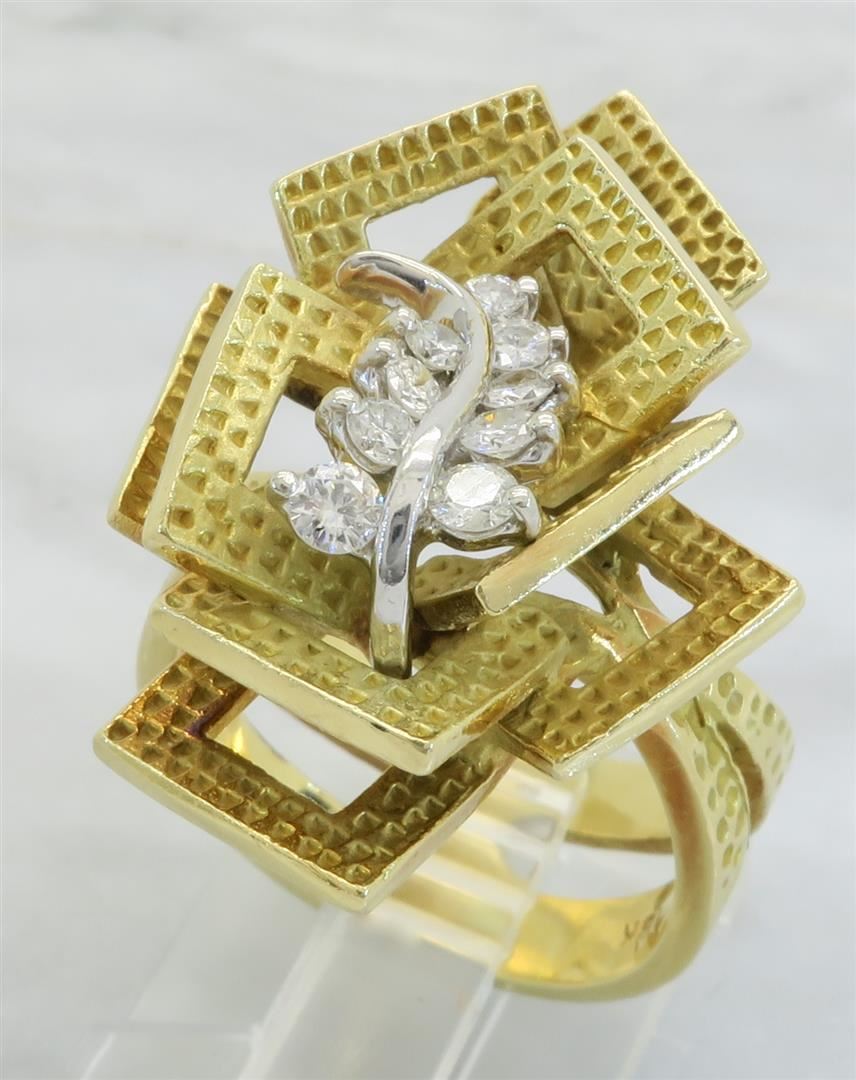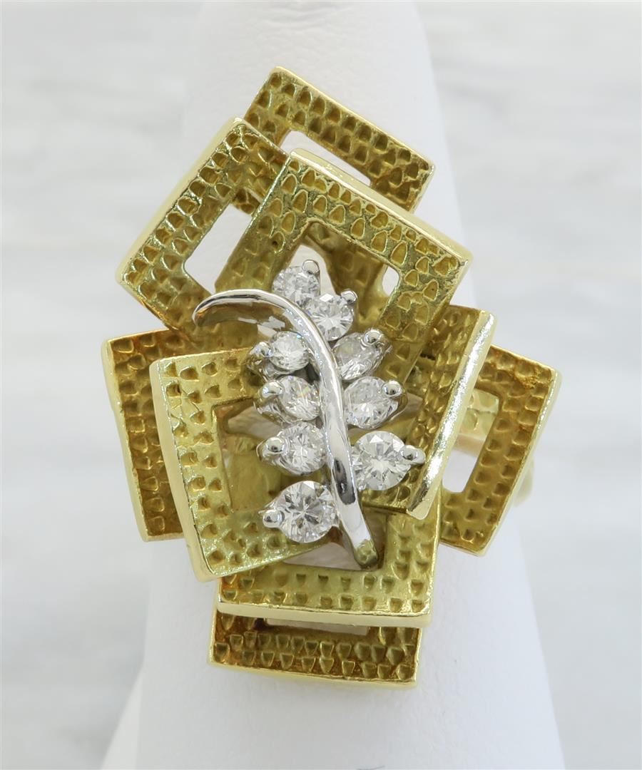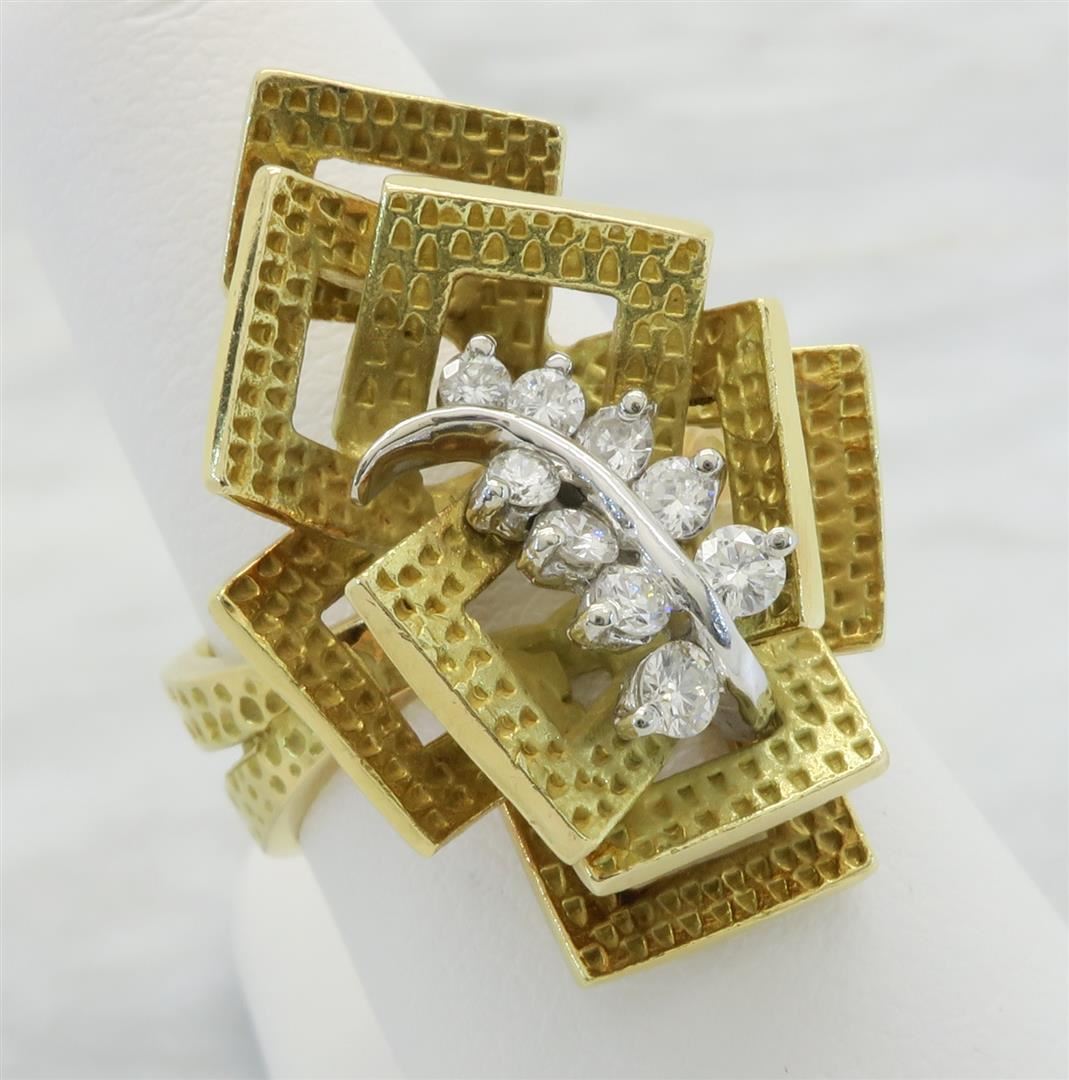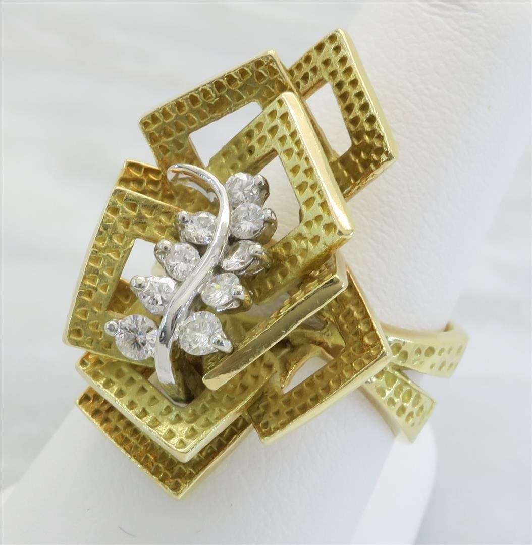 One tested 18K Yellow Gold Diamond Ring. Features: 9 Round Brilliant Cut Diamonds. Clarity: I, Color: G-I. The Total Approximate Weight: .35CTW. All diamonds graded as mounting permits unless otherwise stated. Weight of ring: 13.5 grams, Size: 6.75