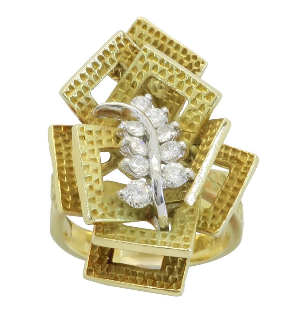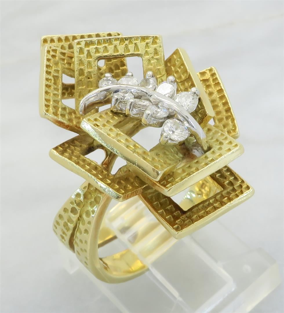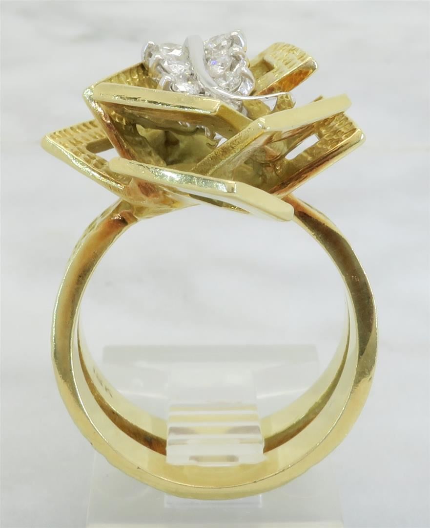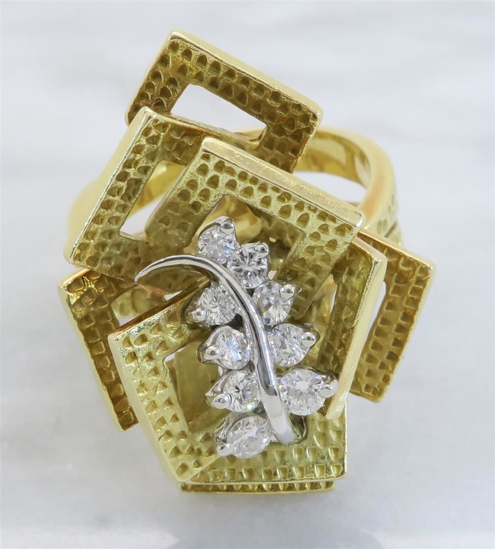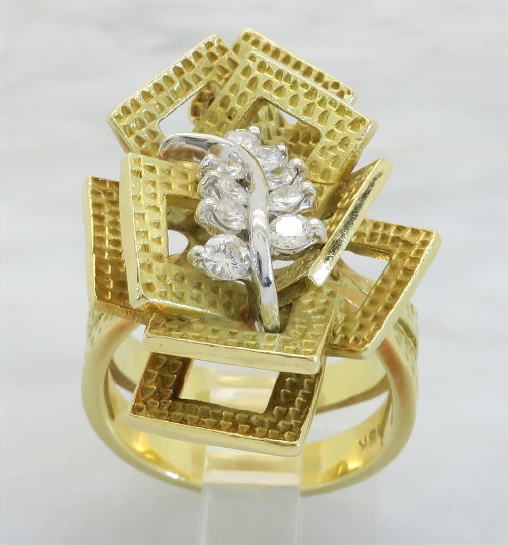 One tested 18K Yellow Gold Diamond Ring. Features: 9 Round Brilliant Cut Diamonds. Clarity: I, Color: G-I. The Total Approximate Weight: .35CTW. All diamonds graded as mounting permits unless otherwise stated. Weight of ring: 13.5 grams, Size: 6.75