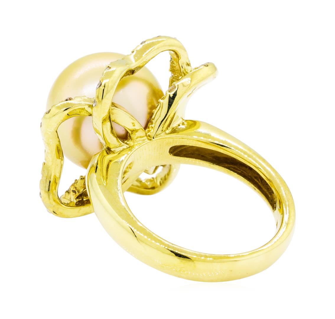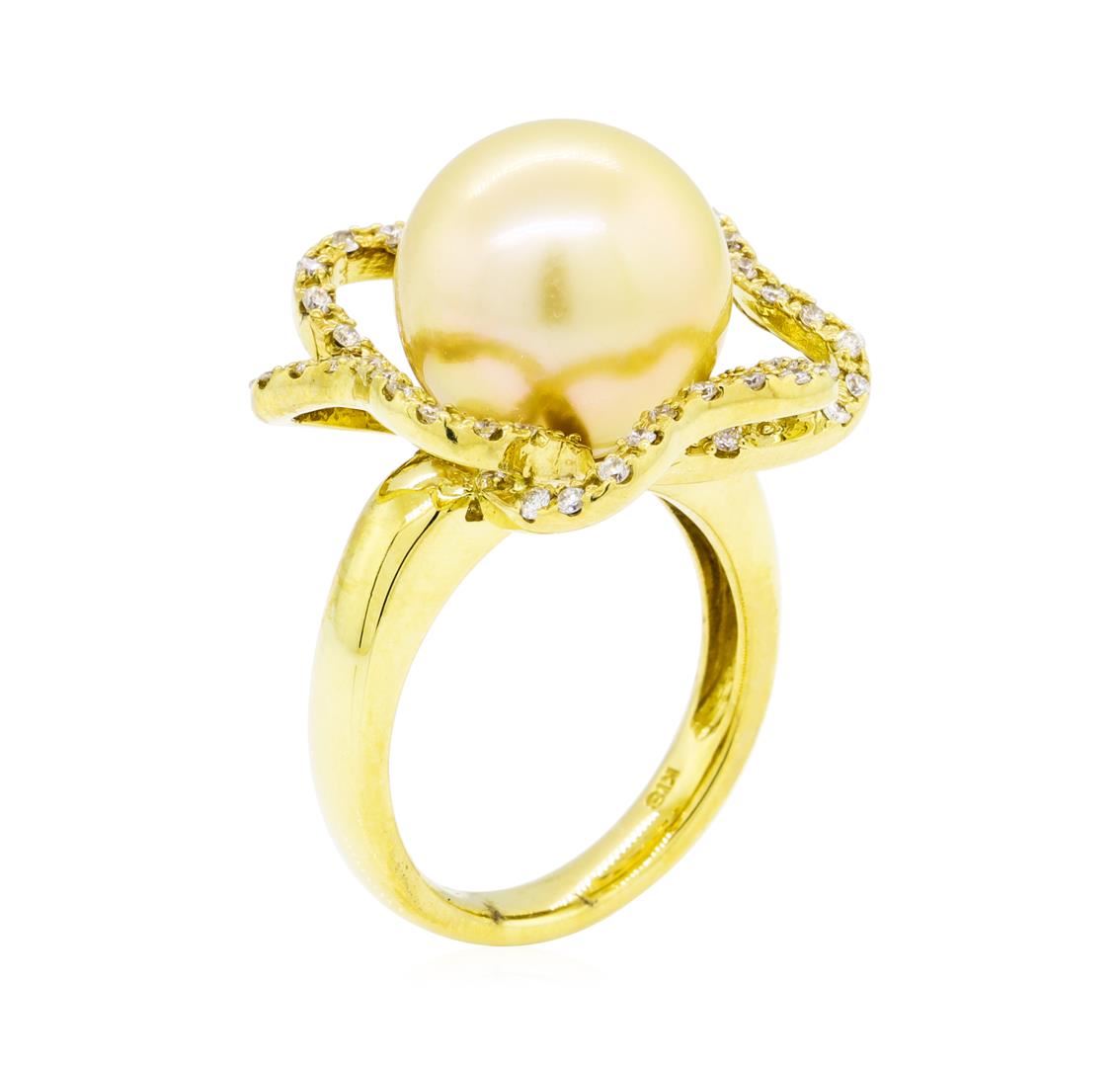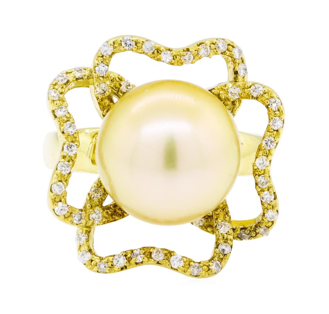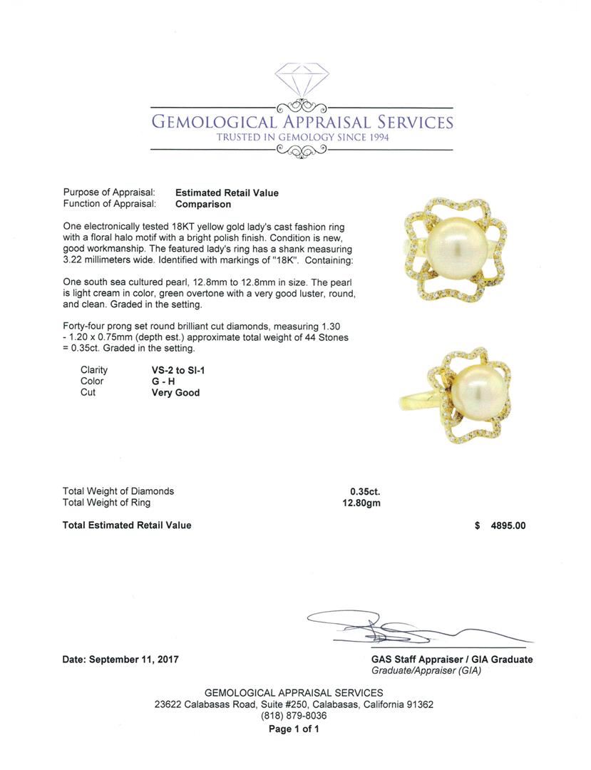 One electronically tested 18KT yellow gold lady's cast fashion ring with a floral halo motif with a bright polish finish. The featured lady's ring has a shank measuring 3.22 millimeters wide. Identified with markings of '18K'. Condition is new, good workmanship. Containing: One south sea cultured pearl, 12.8mm to 12.8mm in size. The pearl is light cream in color, green overtone with a very good luster, round, and clean. Graded in the setting. Forty-Four prong set round brilliant cut diamonds, measuring 1.30 - 1.20 x 0.75mm (depth est.) approximate total weight of 44 Stones = 0.35ct. Graded in the setting. Color G - H Clarity VS-2 to SI-1 Cut Very Good. Total Weight of Diamonds 0.35ct.. Total Weight of Ring 12.80gm GAS Appraised at $4895.00. GAS Appraised at $4,895.00.