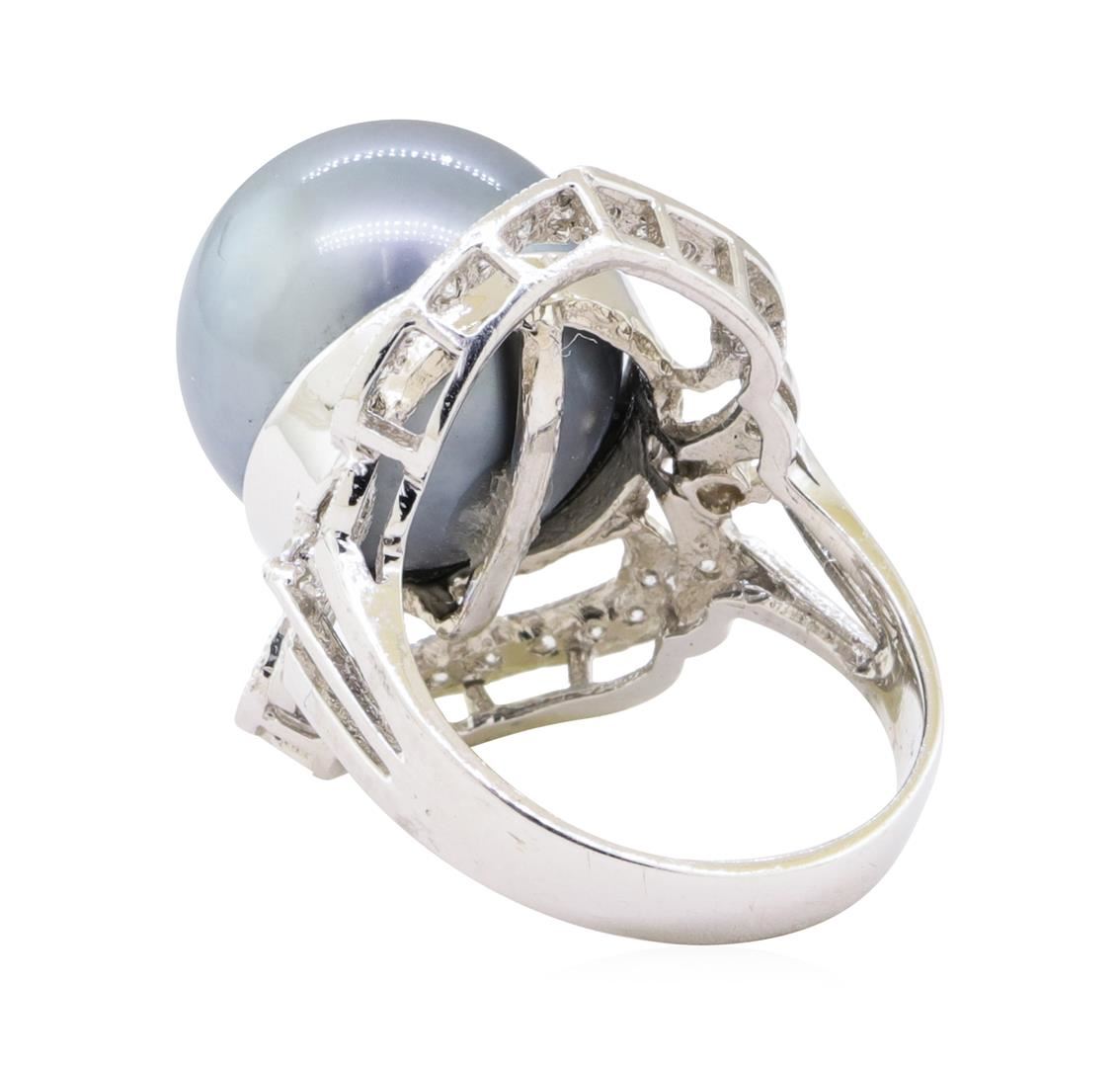 One electronically tested 14KT white gold ladies cast Tahitian cultured pearl and diamond ring.  The featured Tahitian cultured pearl is set within a stylized mirroring diamond design supported by three way split shoulders, completed by a three millimeter wide band. Bright polish finish with milgrain detailing throughout. Identified with markings of "K14". Condition is new, good workmanship. Containing: One Tahitian cultured pearl, 13.5mm in size.  The pearl is dark silver in color with a very good luster, near round, mostly clean  Graded in the setting. Tahitian cultured pearls form in the large "Black Lipped" Pinctada Margaritiferid oyster, which is about twice the size of the Japanese Akoya oyster. This warm water species from across the central and South Pacific Ocean is at home in the bays and lagoons of the islands & atolls of French Polynesia. Tahitian cultured pearl farmers generally raise their oysters in lagoons. Tahitian cultured pearls take from two to four years to form. Black pearls are known for their iridescent, vibrant, almost metallic natural colors, unique among saltwater cultured pearls. Though commonly called "Tahitian" pearls, they are actually gray, to a lighter or darker degree. Tahitian pearls have the unique ability to display a variety of colors at the same time, which can be seen glistening on their surface. Thirty-Two bead set round brilliant cut diamonds approximate total weight of 32 Stones = 0.35ct.  Graded in the setting. Clarity VS-1 to SI-1 Color F - H Total Weight of Diamonds 0.35 ct. Total Weight of Ring 8.54 gm Estimated Retail Value $     4,280.00 US