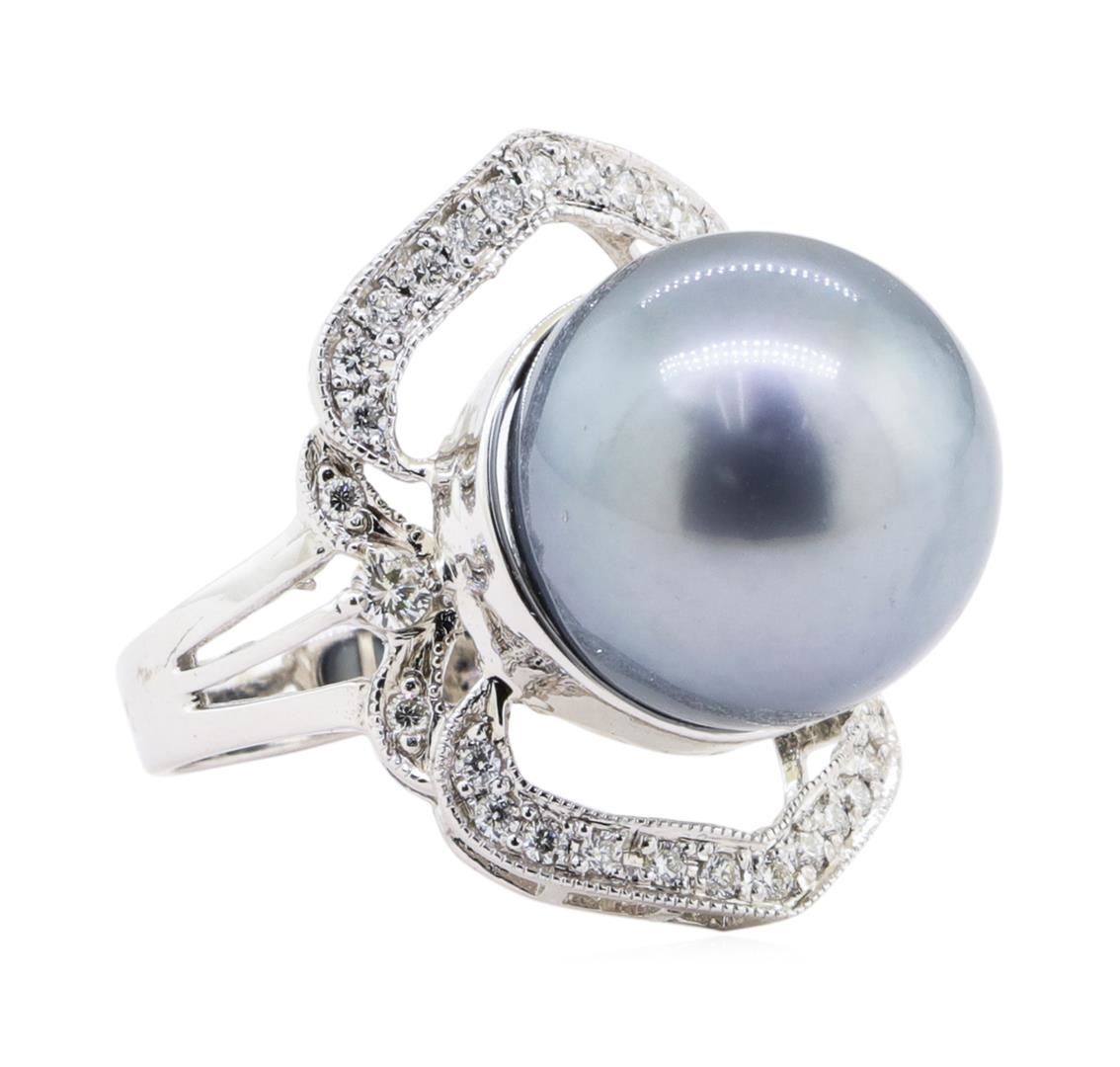 One electronically tested 14KT white gold ladies cast Tahitian cultured pearl and diamond ring.  The featured Tahitian cultured pearl is set within a stylized mirroring diamond design supported by three way split shoulders, completed by a three millimeter wide band. Bright polish finish with milgrain detailing throughout. Identified with markings of "K14". Condition is new, good workmanship. Containing: One Tahitian cultured pearl, 13.5mm in size.  The pearl is dark silver in color with a very good luster, near round, mostly clean  Graded in the setting. Tahitian cultured pearls form in the large "Black Lipped" Pinctada Margaritiferid oyster, which is about twice the size of the Japanese Akoya oyster. This warm water species from across the central and South Pacific Ocean is at home in the bays and lagoons of the islands & atolls of French Polynesia. Tahitian cultured pearl farmers generally raise their oysters in lagoons. Tahitian cultured pearls take from two to four years to form. Black pearls are known for their iridescent, vibrant, almost metallic natural colors, unique among saltwater cultured pearls. Though commonly called "Tahitian" pearls, they are actually gray, to a lighter or darker degree. Tahitian pearls have the unique ability to display a variety of colors at the same time, which can be seen glistening on their surface. Thirty-Two bead set round brilliant cut diamonds approximate total weight of 32 Stones = 0.35ct.  Graded in the setting. Clarity VS-1 to SI-1 Color F - H Total Weight of Diamonds 0.35 ct. Total Weight of Ring 8.54 gm Estimated Retail Value $     4,280.00 US
