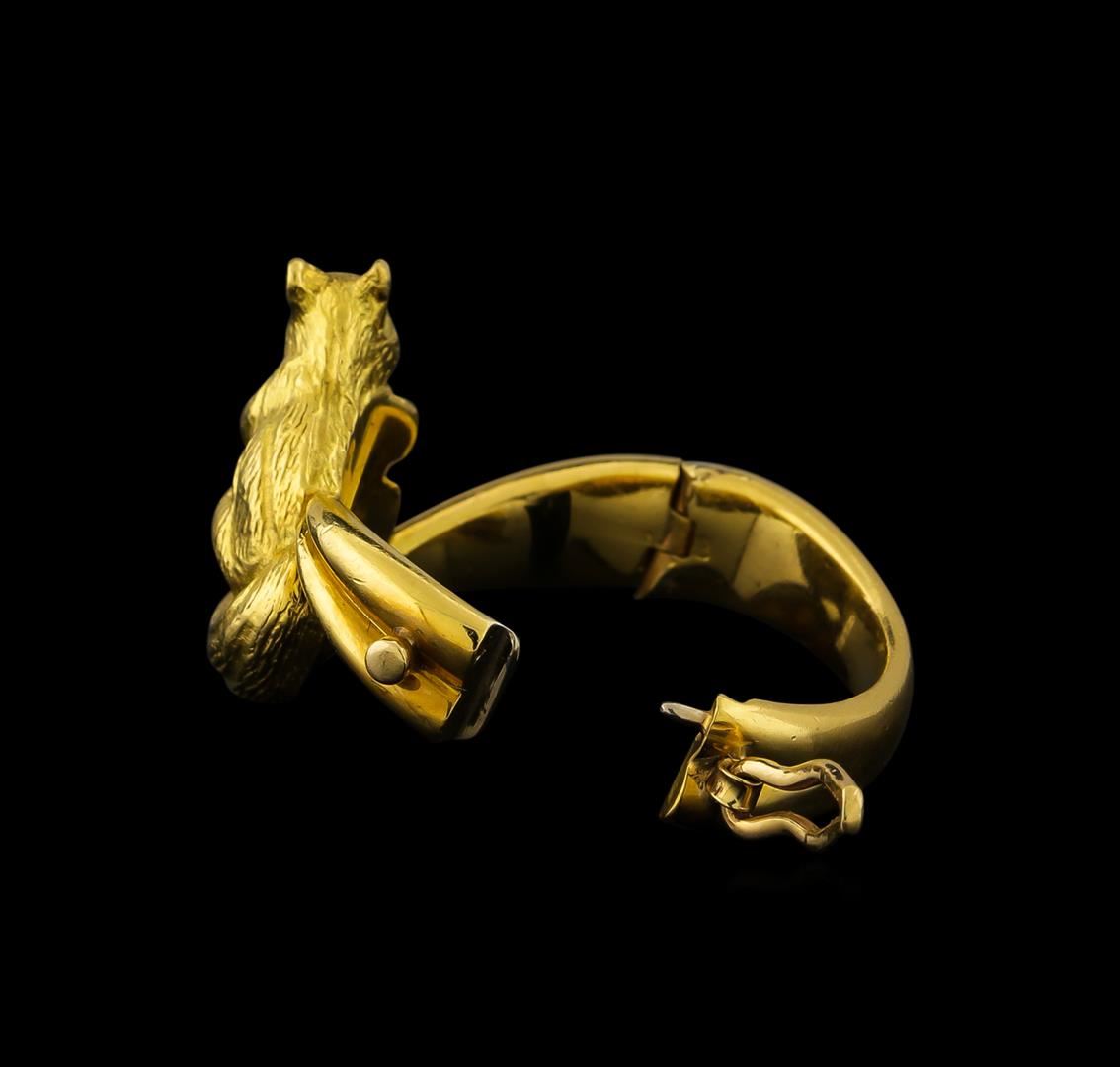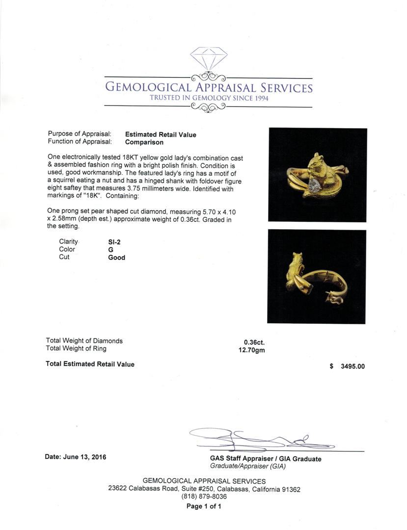 One electronically tested 18KT yellow gold lady's combination cast & assembled fashion ring with a bright polish finish. The featured lady's ring has a motif of a squirrel eating a nut and has a hinged shank with foldover figure eight safety that measures 3.75 millimeters wide. Identified with markings of "18K". Condition is used, good workmanship. Containing: One prong set pear shaped cut diamond, measuring 5.70 x 4.10 x 2.58mm (depth est.) approximate weight of 0.36ct. Graded in the setting. Clarity: SI-2. Color: Good. Total Weight of Diamonds 0.36ct. Total Weight of Ring 12.70gm. GAS Appraised at $3,495.00.