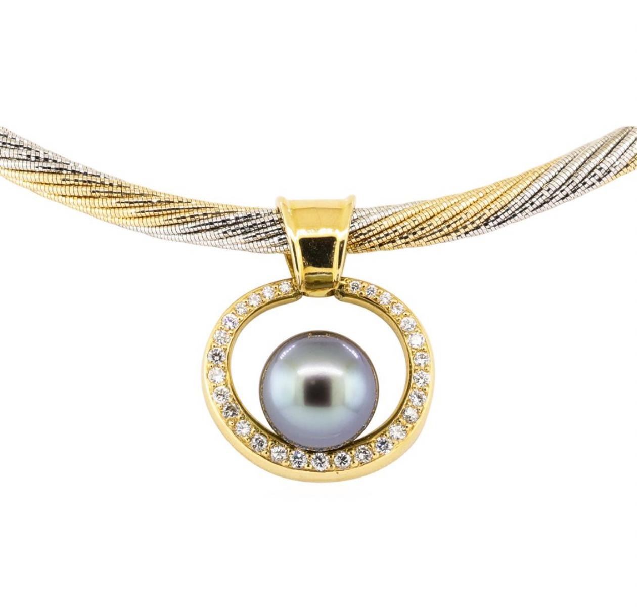 One electronically tested 14-18KT yellow and white gold lady's combination cast & assembled fashion pendant and chain 18.0' long, 4.5mm designer twisted link with a lobster claw clasp with a dangle oval motif with a bright polish finish. The featured lady's pendant is cast from 18KT yellow gold and has an attached 14KT yellow and white gold chain. Identified with markings of '14K / 18K'. Condition is like new, good workmanship. Containing: One Tahitian pearl, 11.8mm to 11.8mm in size. The pearl is black in color, green overtone with a very good luster, round, and clean. Graded in the setting. Twenty-Nine prong set round brilliant cut diamonds, measuring 1.70 - 1.25 x 0.92mm (depth est.) approximate total weight of 29 Stones = 0.36ct. Graded in the setting. Color F - G Clarity VVS-2 to VS-1 Cut Very Good. Total Weight of Diamonds 0.36ct.. Total Weight of Pendant And Chain 46.30gm GAS Appraised at $7510.00. GAS Appraised.