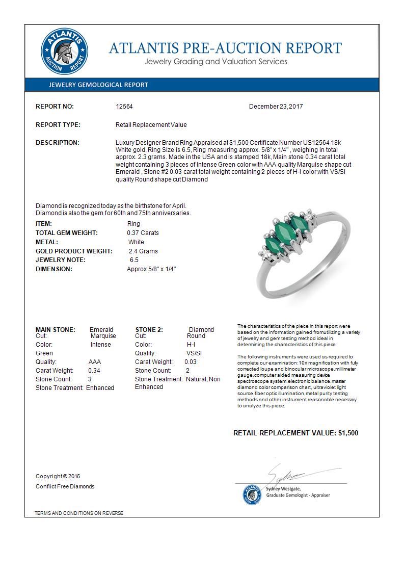 REF-23W3F -12564 ---- 0.37 CTW Emerald & Diamond Ring 18K White Gold ---- Luxury Designer Brand Ring Appraised at $1,500 Certificate Number US12564 18k White gold, Ring Size is 6.5, Ring measuring approx. 5/8" x 1/4" , weighing in total approx. 2.3 grams. Made in the USA and is stamped 18k, Main stone 0.34 carat total weight containing 3 pieces of Intense Green color with AAA quality Marquise shape cut Emerald , Stone #2 0.03 carat total weight containing 2 pieces of H-I color with VS/SI quality Round shape cut Diamond