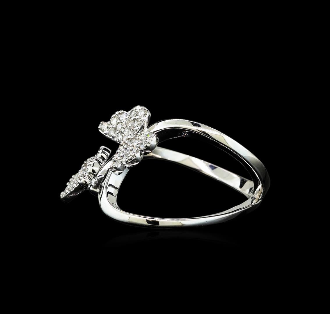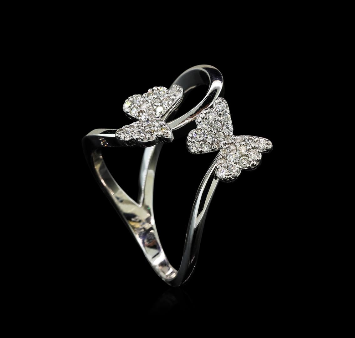 One electronically tested 14KT white gold lady's combination cast & assembled fashion ring with a bright polish finish. The featured lady's ring has two offset butterfly motifs and a shank measuring 1.76 millimeters wide. Identified with markings of 'K14'. Condition is new, good workmanship. Containing: Twenty prong set round brilliant cut diamonds, measuring 1.40 - 1.35 x 0.86mm (depth est.) approximate total weight of 20 Stones = 0.20ct. Graded in the setting. Clarity SI-1 to SI-2. Color: G - H Cut Good Sixteen prong set round brilliant cut diamonds, measuring 1.30 - 1.20 x 0.75mm (depth est.) approximate total weight of 16 Stones = 0.11ct. Graded in the setting. Clarity SI-1 to I-1. Color: G - H Cut Good Twelve prong set round brilliant cut diamonds, measuring 1.10 - 1.05 x 0.67mm (depth est.) approximate total weight of 12 Stones = 0.06ct. Graded in the setting. Clarity SI-1 to I-1. Color: G - H Cut Good. Total Weight of Diamonds 0.37ct.. Total Weight of Ring 4.40gm GAS Appraised at $2,040.00.