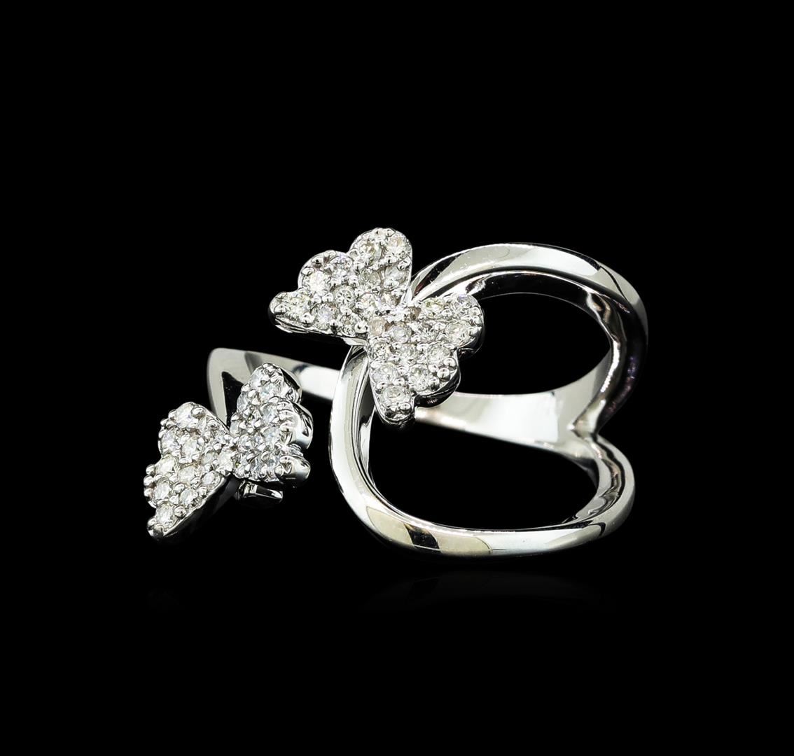 One electronically tested 14KT white gold lady's combination cast & assembled fashion ring with a bright polish finish. The featured lady's ring has two offset butterfly motifs and a shank measuring 1.76 millimeters wide. Identified with markings of 'K14'. Condition is new, good workmanship. Containing: Twenty prong set round brilliant cut diamonds, measuring 1.40 - 1.35 x 0.86mm (depth est.) approximate total weight of 20 Stones = 0.20ct. Graded in the setting. Clarity SI-1 to SI-2. Color: G - H Cut Good Sixteen prong set round brilliant cut diamonds, measuring 1.30 - 1.20 x 0.75mm (depth est.) approximate total weight of 16 Stones = 0.11ct. Graded in the setting. Clarity SI-1 to I-1. Color: G - H Cut Good Twelve prong set round brilliant cut diamonds, measuring 1.10 - 1.05 x 0.67mm (depth est.) approximate total weight of 12 Stones = 0.06ct. Graded in the setting. Clarity SI-1 to I-1. Color: G - H Cut Good. Total Weight of Diamonds 0.37ct.. Total Weight of Ring 4.40gm GAS Appraised at $2,040.00.