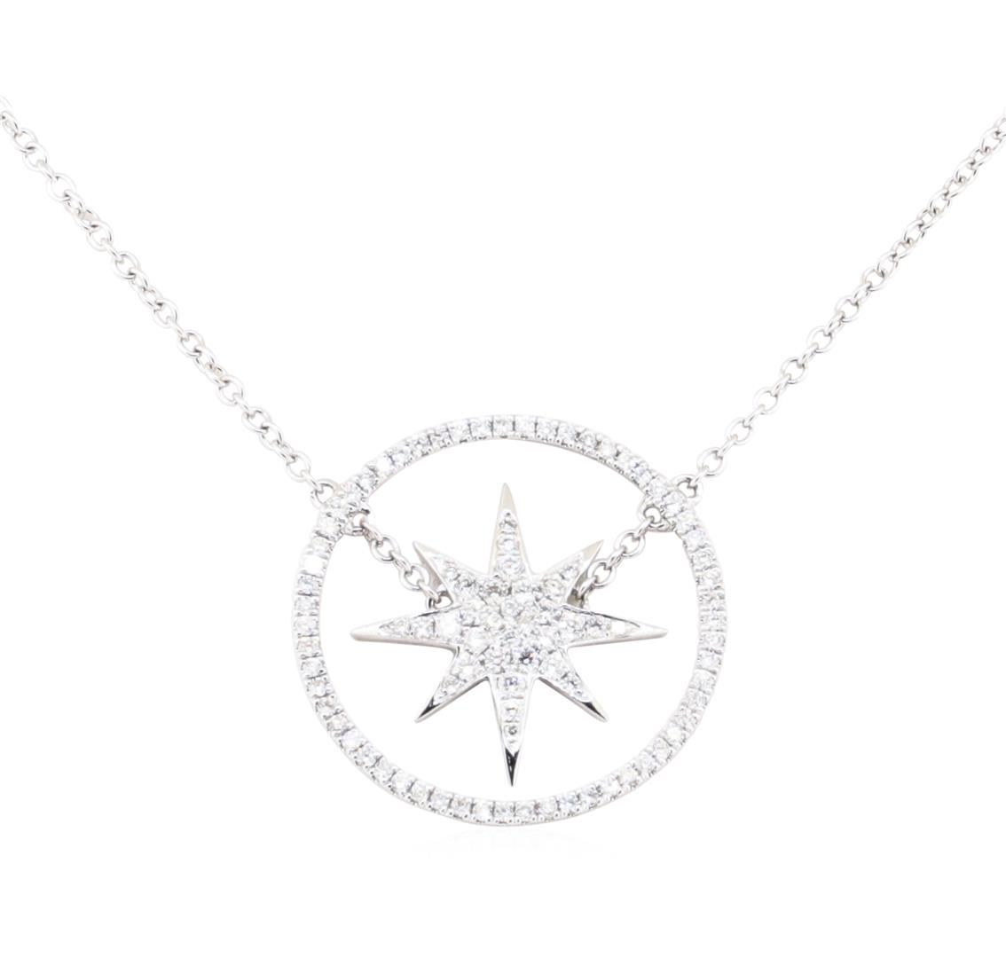 One starburst and circle pendant with chain featuring: 18KT white gold weighing 3.4 grams containing diamonds weighing 0.38ctw. The chain is a 1mm rounded cable link chain measuring eighteen inches in length that can be adjusted to sixteen inches.