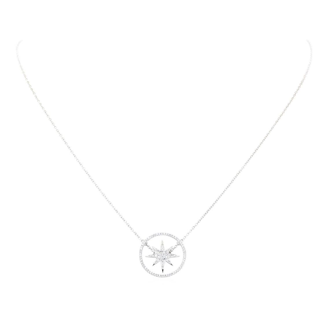 One starburst and circle pendant with chain featuring: 18KT white gold weighing 3.4 grams containing diamonds weighing 0.38ctw. The chain is a 1mm rounded cable link chain measuring eighteen inches in length that can be adjusted to sixteen inches.