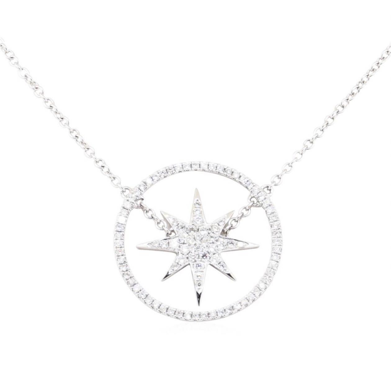 One starburst and circle pendant with chain featuring: 18KT white gold weighing 3.4 grams containing diamonds weighing 0.38ctw. The chain is a 1mm rounded cable link chain measuring eighteen inches in length that can be adjusted to sixteen inches.