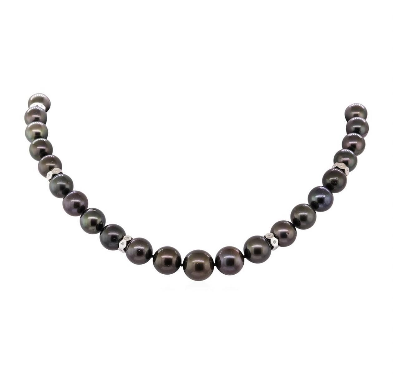 One graduated single strand pearl necklace 18.0' princess length, knotted with a tongue clasp containing 37 Tahitian pearls, 13.9mm to 10.1mm in size. The pearls are black in color, green overtone with a very good luster, round, and mostly clean with very GAS Appraised.