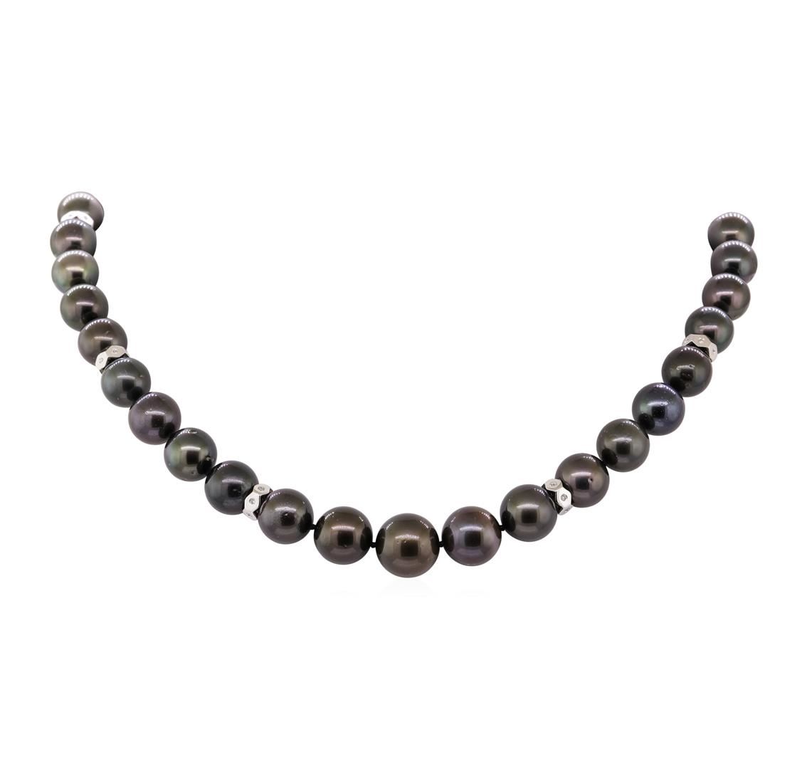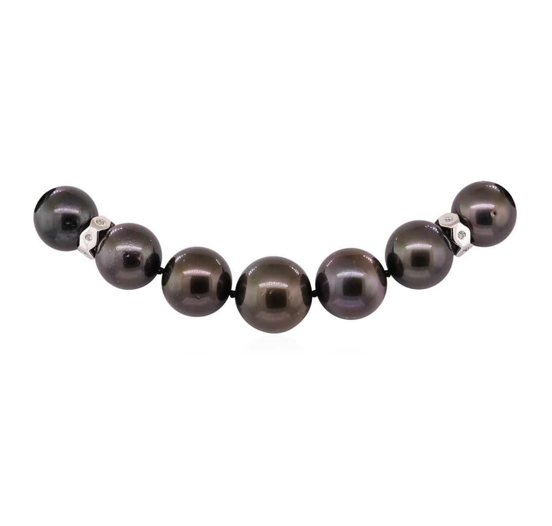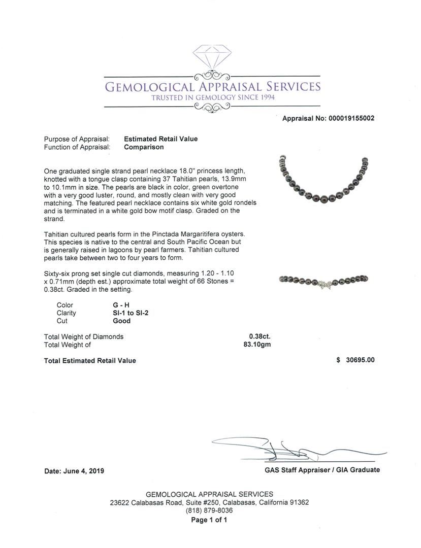 One graduated single strand pearl necklace 18.0' princess length, knotted with a tongue clasp containing 37 Tahitian pearls, 13.9mm to 10.1mm in size. The pearls are black in color, green overtone with a very good luster, round, and mostly clean with very GAS Appraised.