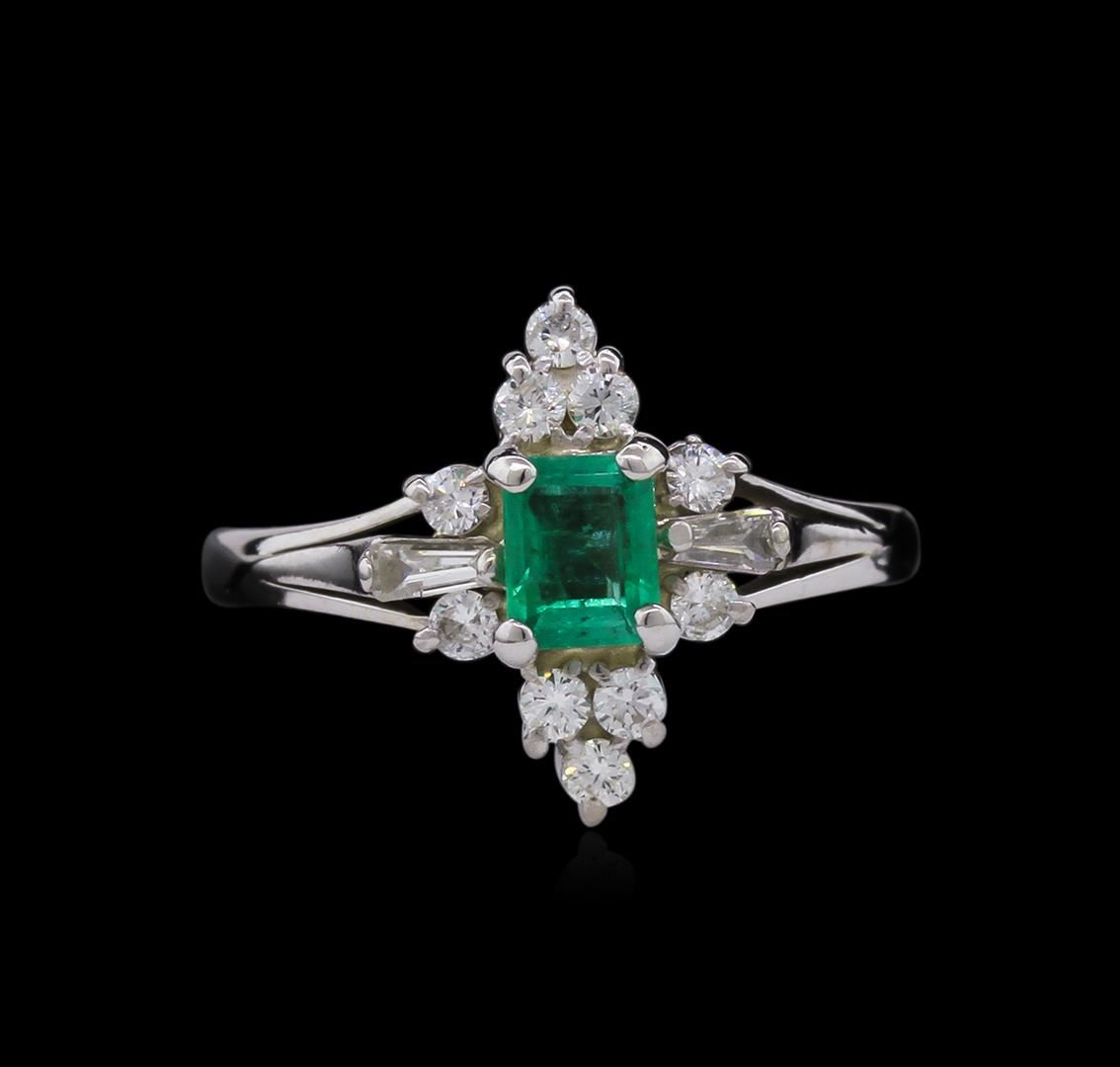 One electronically tested 14KT white gold lady's cast fashion ring with a basket setting with a bright polish finish. The featured lady's ring has a shank measuring 1.55 millimeters wide. Identified with markings of "14K". Condition is like new, good workmanship. Containing: One prong set emerald standard step cut natural emerald, measuring 4.90 x 3.90 x 2.73mm, approximate weight of 0.38ct., clarity is slightly included, type III, medium, moderately strong, green color, (GIA G 5/4), cut is good. Naturally occurring internal & external characteristics are present. Indications of oil residue. Colored gemstones are presumed to have been subjected to commonly used enhancement processes. Graded in the setting. Ten prong set round brilliant cut diamonds, measuring 1.90 - 1.85 x 1.17mm (depth est.) approximate total weight of 10 Stones = 0.25ct. Graded in the setting. Clarity: VS-2 to SI-1. Color: G - Good Two prong set baguette cut (tapered) diamonds, measuring from 3.00 x 1.30 x 1.11mm (depth est.) to 3.20 x 1.30 x 1.11mm (depth est.) approximate total weight of 2 Stones = 0.09ct. Graded in the setting. Clarity: VS-2. Color: H - I. Cut Good. Total Weight of Colored Stones 0.38ct. Total Weight of Diamonds 0.34ct. Total Weight of Ring 3.60gm. GAS Appraised at $1,720.00.