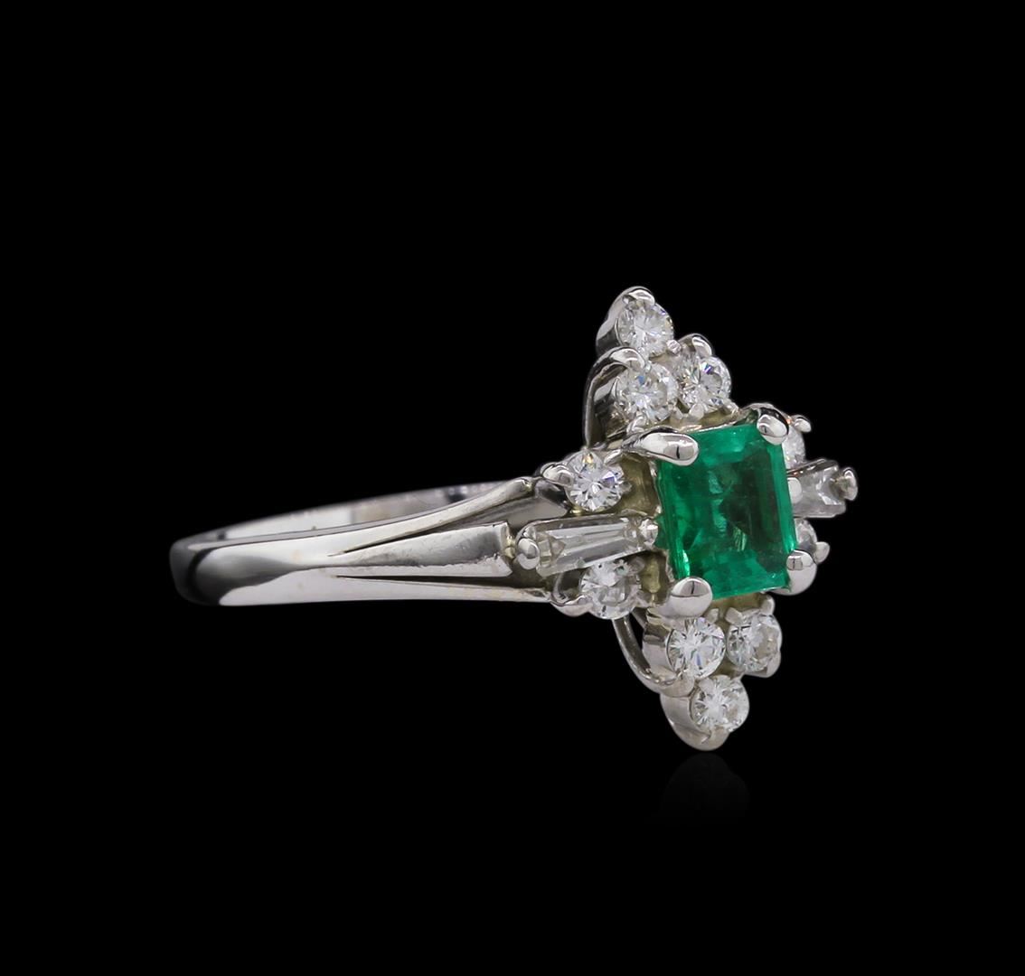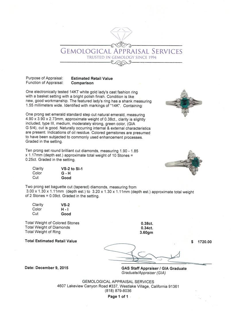 One electronically tested 14KT white gold lady's cast fashion ring with a basket setting with a bright polish finish. The featured lady's ring has a shank measuring 1.55 millimeters wide. Identified with markings of "14K". Condition is like new, good workmanship. Containing: One prong set emerald standard step cut natural emerald, measuring 4.90 x 3.90 x 2.73mm, approximate weight of 0.38ct., clarity is slightly included, type III, medium, moderately strong, green color, (GIA G 5/4), cut is good. Naturally occurring internal & external characteristics are present. Indications of oil residue. Colored gemstones are presumed to have been subjected to commonly used enhancement processes. Graded in the setting. Ten prong set round brilliant cut diamonds, measuring 1.90 - 1.85 x 1.17mm (depth est.) approximate total weight of 10 Stones = 0.25ct. Graded in the setting. Clarity: VS-2 to SI-1. Color: G - Good Two prong set baguette cut (tapered) diamonds, measuring from 3.00 x 1.30 x 1.11mm (depth est.) to 3.20 x 1.30 x 1.11mm (depth est.) approximate total weight of 2 Stones = 0.09ct. Graded in the setting. Clarity: VS-2. Color: H - I. Cut Good. Total Weight of Colored Stones 0.38ct. Total Weight of Diamonds 0.34ct. Total Weight of Ring 3.60gm. GAS Appraised at $1,720.00.