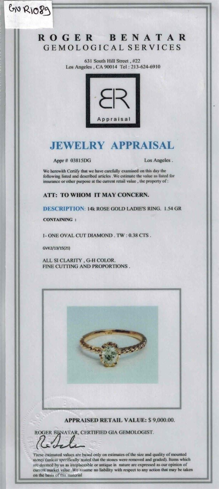 14K ROSE GOLD NATURAL DIAMOND RING:1.54 GRAMS/DIAMOND:0.38CT//#GVR1089 **Warmly crafted in 14k rose gold, this 0.09ct Oval Cut Diamond Solitaire sparkles dynamically. A stone of mental and psychic activation, Diamonds promote truth, vision and alignment with the higher mind, for those who use them consciously. This engagement ring has a woven detailed shank adding a classically elegant appeal.**