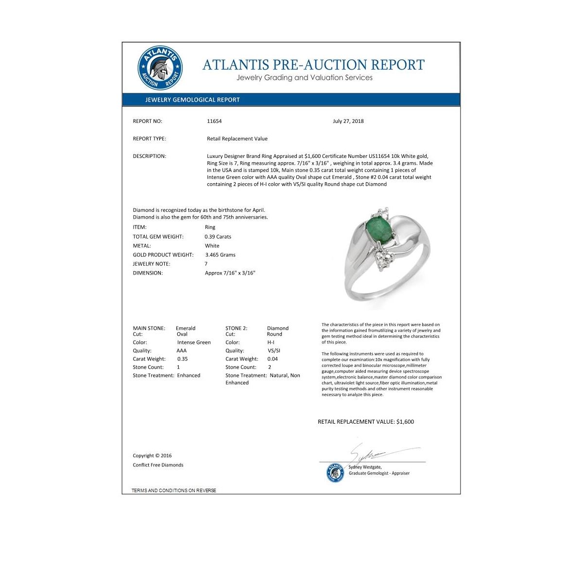 REF-24A2X -11654 ---- 0.39 CTW Emerald & Diamond Ring 10K White Gold ---- Luxury Designer Brand Ring Appraised at $1,600 Certificate Number US11654 10k White gold, Ring Size is 7, Ring measuring approx. 7/16" x 3/16" , weighing in total approx. 3.4 grams. Made in the USA and is stamped 10k, Main stone 0.35 carat total weight containing 1 pieces of Intense Green color with AAA quality Oval shape cut Emerald , Stone #2 0.04 carat total weight containing 2 pieces of H-I color with VS/SI quality Round shape cut Diamond