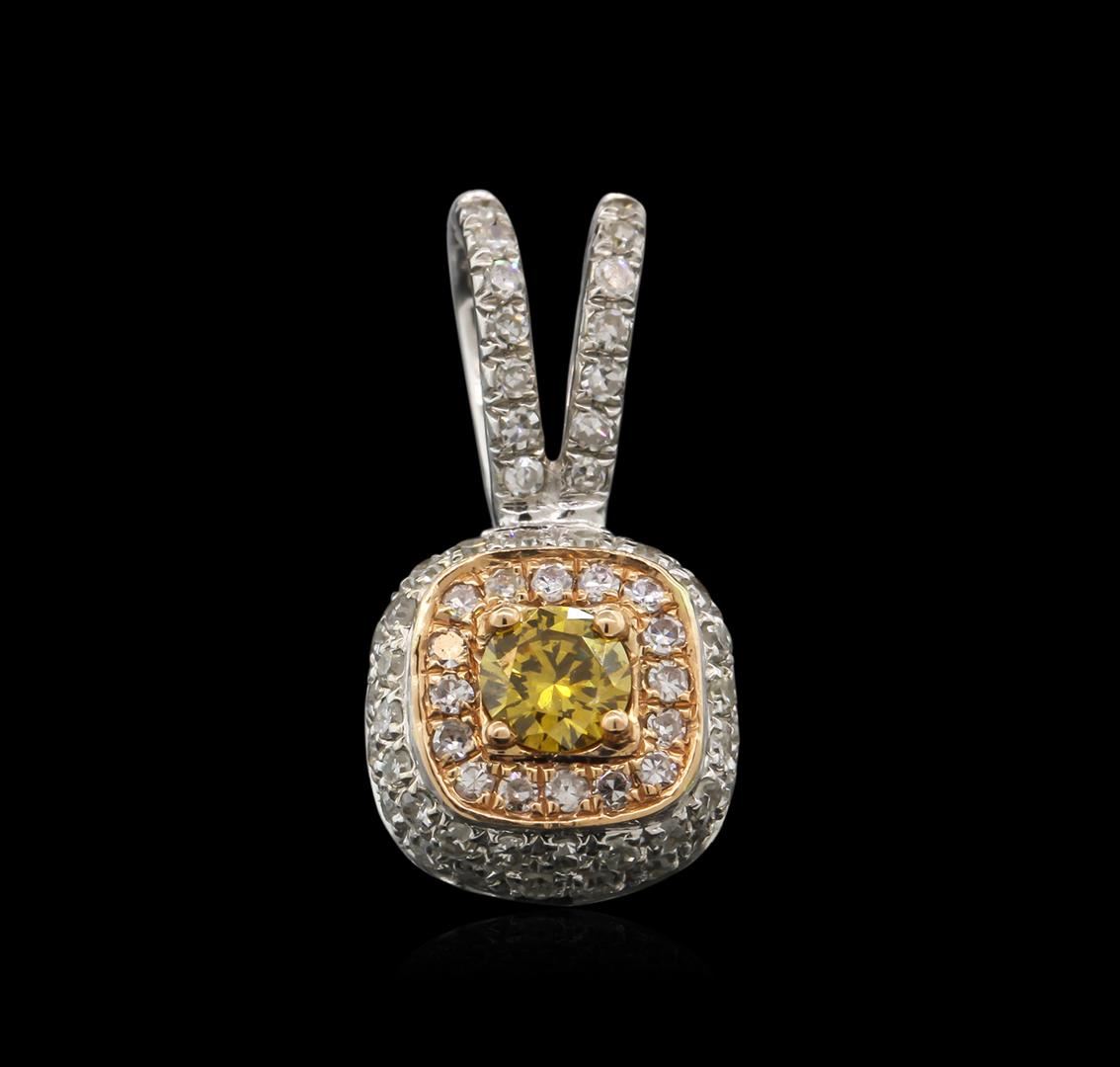 One pendant featuring: 14KT white and rose gold weighing 1.94 grams containing one fancy yellow diamond center stone with a total weight of 0.26ct and white diamond side stones with a total weight of 0.13ct.
