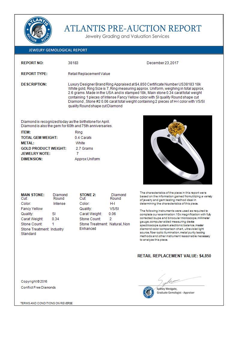 REF-80W2F -38183 ---- 0.4 CTW Intense Fancy Yellow Diamond Engagement Art Deco Ring 18K White Gold ---- Luxury Designer Brand Ring Appraised at $4,850 Certificate Number US38183 18k White gold, Ring Size is 7, Ring measuring approx. Uniform, weighing in total approx. 2.6 grams. Made in the USA and is stamped 18k, Main stone 0.34 carat total weight containing 1 pieces of Intense Fancy Yellow color with SI quality Round shape cut Diamond , Stone #2 0.06 carat total weight containing 2 pieces of H-I color with VS/SI quality Round shape cut Diamond