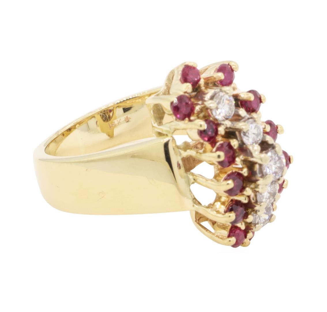 One electronically tested 14KT yellow gold lady's cast fashion ring with a waterfall with a bright polish finish. This featured lady's ring has a shank measuring 3.95 millimeters in width. Identified with markings of '14K'. Condition is like new, good workmanship. Containing: Five prong set round brilliant cut diamonds, measuring 2.80 - 2.70 x 1.71mm (depth est.) approximate total weight of 5 Stones = 0.40ct. Graded in the setting. Color H - I Clarity VS-2 to SI-1 Cut Good Fourteen prong set round modified mixed cut natural rubies, measuring 2.20 - 2.00 x 1.37 mm, (depth est.) approximate total weight of 0.70ct., clarity is slightly included, medium dark, moderately strong, red color, (GIA R 6/4), cut is good. Colored gemstones are presumed to have been subjected to commonly used enhancement processes. Graded in the setting. Total Weight of Colored Stones 0.70ct.. Total Weight of Diamonds 0.40ct.. Total Weight of Ring 9.10gm GAS Appraised at $2220.00. GAS Appraised.