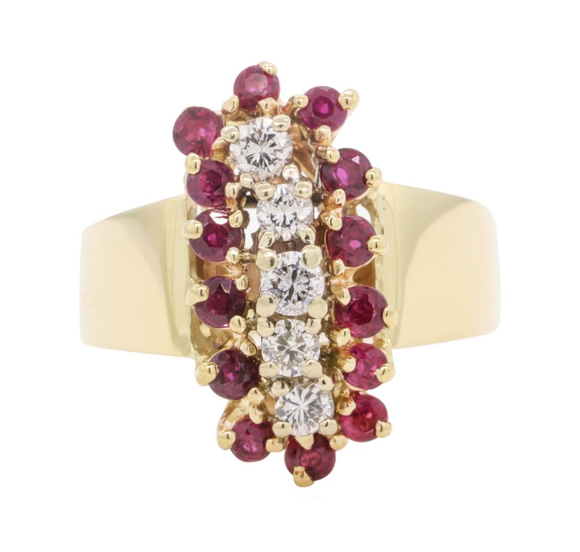 One electronically tested 14KT yellow gold lady's cast fashion ring with a waterfall with a bright polish finish. This featured lady's ring has a shank measuring 3.95 millimeters in width. Identified with markings of '14K'. Condition is like new, good workmanship. Containing: Five prong set round brilliant cut diamonds, measuring 2.80 - 2.70 x 1.71mm (depth est.) approximate total weight of 5 Stones = 0.40ct. Graded in the setting. Color H - I Clarity VS-2 to SI-1 Cut Good Fourteen prong set round modified mixed cut natural rubies, measuring 2.20 - 2.00 x 1.37 mm, (depth est.) approximate total weight of 0.70ct., clarity is slightly included, medium dark, moderately strong, red color, (GIA R 6/4), cut is good. Colored gemstones are presumed to have been subjected to commonly used enhancement processes. Graded in the setting. Total Weight of Colored Stones 0.70ct.. Total Weight of Diamonds 0.40ct.. Total Weight of Ring 9.10gm GAS Appraised at $2220.00. GAS Appraised.
