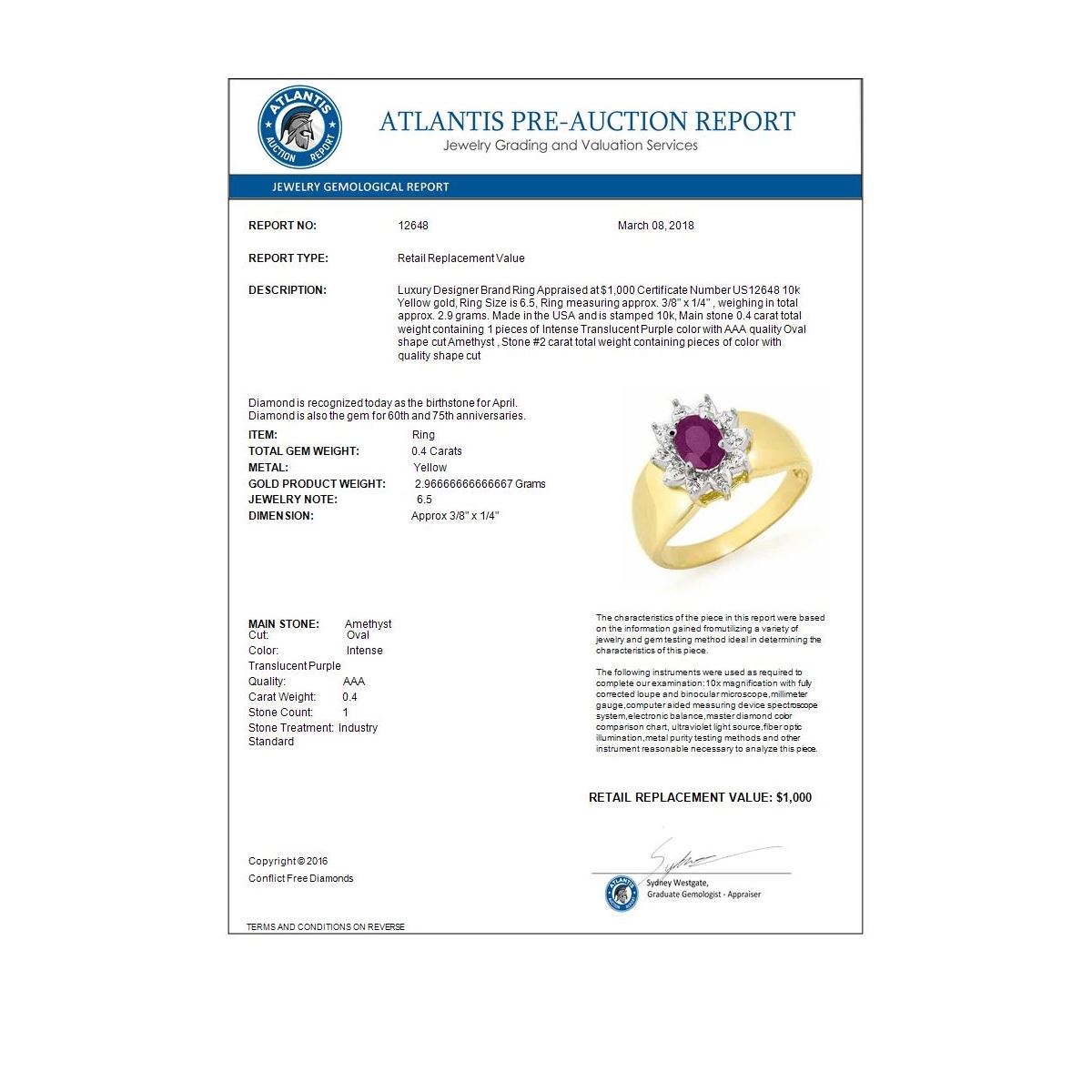 REF-15W5F -12648 ---- 0.40 CTW Amethyst Ring 10K Yellow Gold ---- Luxury Designer Brand Ring Appraised at $1,000 Certificate Number US12648 10k Yellow gold, Ring Size is 6.5, Ring measuring approx. 3/8" x 1/4" , weighing in total approx. 2.9 grams. Made in the USA and is stamped 10k, Main stone 0.4 carat total weight containing 1 pieces of Intense Translucent Purple color with AAA quality Oval shape cut Amethyst , Stone #2 carat total weight containing pieces of color with quality shape cut