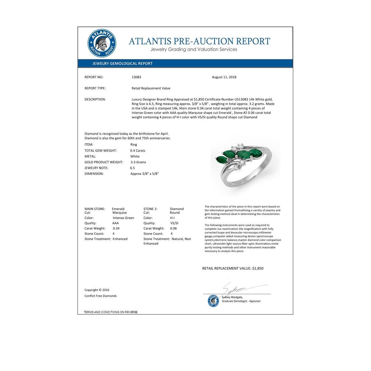 REF-27X8T -13083 ---- 0.40 CTW Emerald & Diamond Ring 14K White Gold ---- Luxury Designer Brand Ring Appraised at $1,850 Certificate Number US13083 14k White gold, Ring Size is 6.5, Ring measuring approx. 3/8" x 5/8" , weighing in total approx. 3.2 grams. Made in the USA and is stamped 14k, Main stone 0.34 carat total weight containing 4 pieces of Intense Green color with AAA quality Marquise shape cut Emerald , Stone #2 0.06 carat total weight containing 4 pieces of H-I color with VS/SI quality Round shape cut Diamond