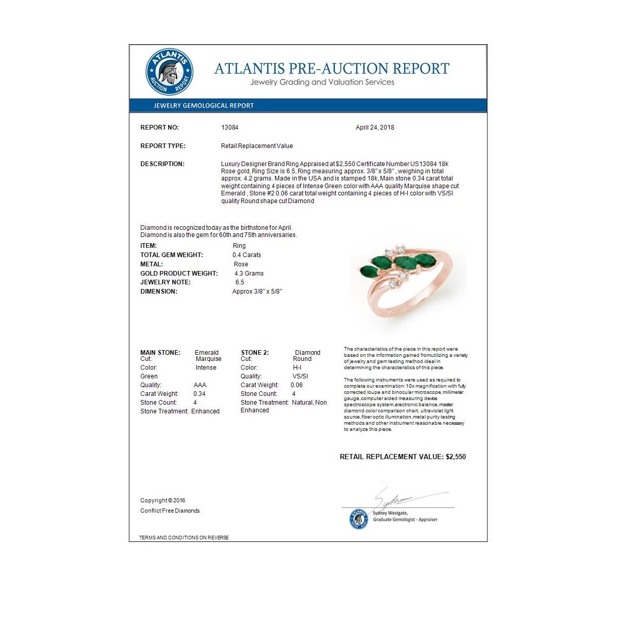REF-38X4T -13084 ---- 0.40 CTW Emerald & Diamond Ring 18K Rose Gold ---- Luxury Designer Brand Ring Appraised at $2,550 Certificate Number US13084 18k Rose gold, Ring Size is 6.5, Ring measuring approx. 3/8" x 5/8" , weighing in total approx. 4.2 grams. Made in the USA and is stamped 18k, Main stone 0.34 carat total weight containing 4 pieces of Intense Green color with AAA quality Marquise shape cut Emerald , Stone #2 0.06 carat total weight containing 4 pieces of H-I color with VS/SI quality Round shape cut Diamond
