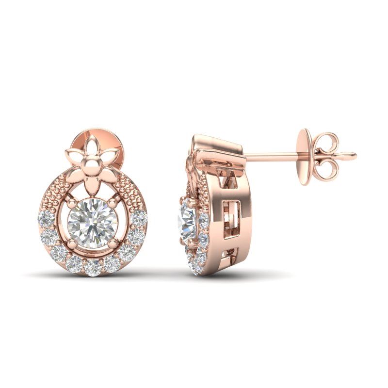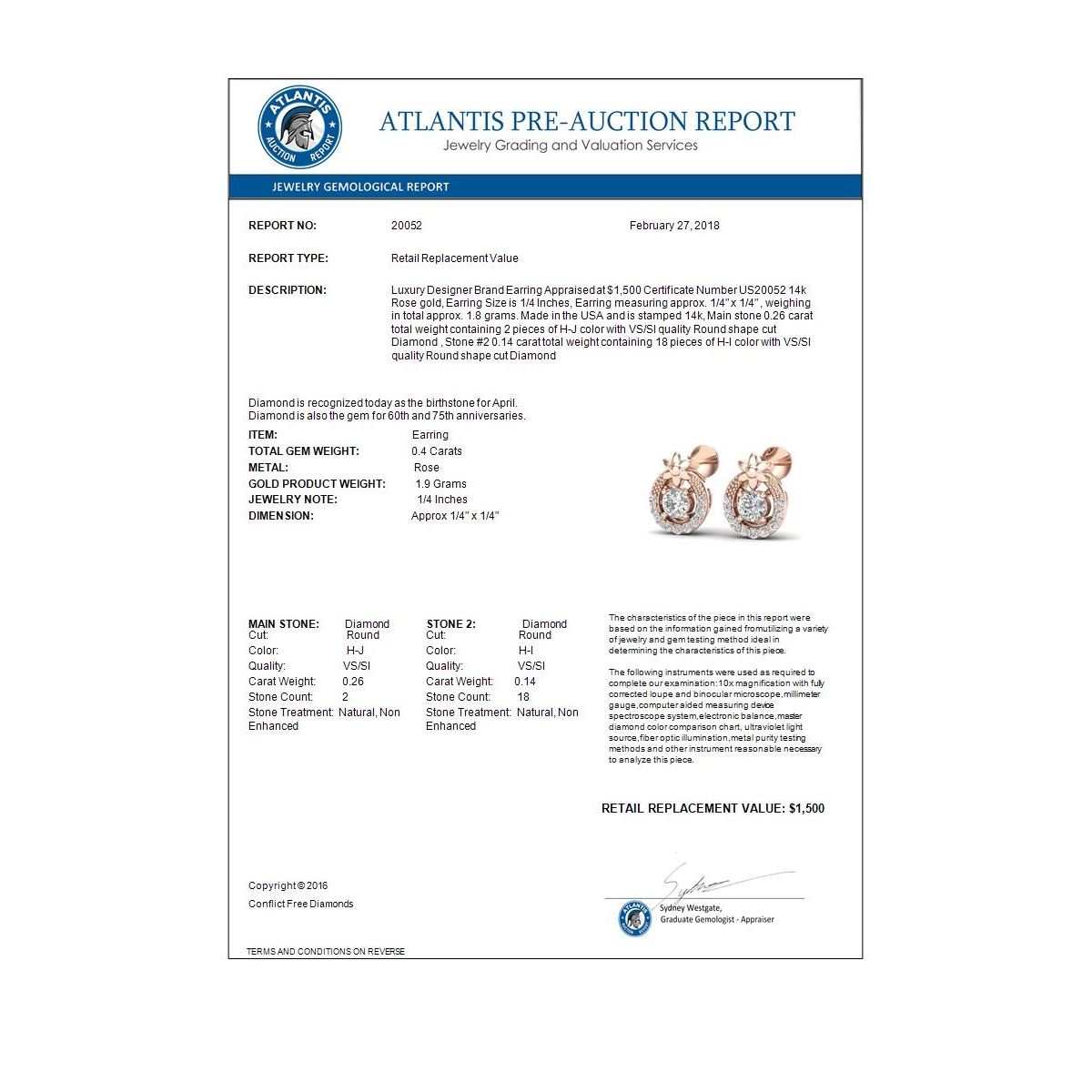 REF-34K5W -20052 ---- 0.40 CTW Micro Pave VS/SI Diamond Halo Solitaire Earrings 14K Rose Gold ---- Luxury Designer Brand Earring Appraised at $1,500 Certificate Number US20052 14k Rose gold, Earring Size is 1/4 Inches, Earring measuring approx. 1/4" x 1/4" , weighing in total approx. 1.8 grams. Made in the USA and is stamped 14k, Main stone 0.26 carat total weight containing 2 pieces of H-J color with VS/SI quality Round shape cut Diamond , Stone #2 0.14 carat total weight containing 18 pieces of H-I color with VS/SI quality Round shape cut Diamond