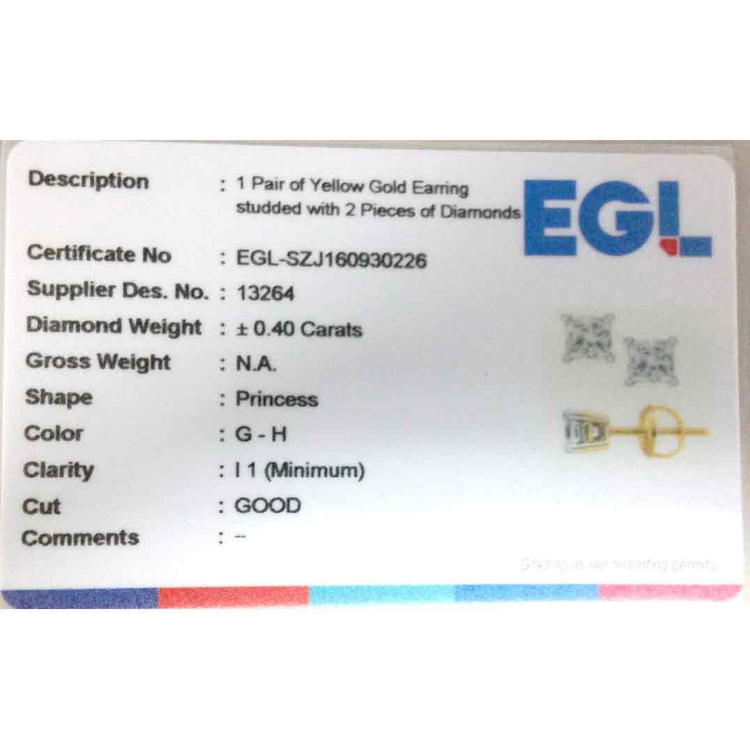 REF-44N9F- SKU: GD13264 ---- 0.40 CTW Princess Diamond Solitaire Stud Earrings 14KT Yellow Gold