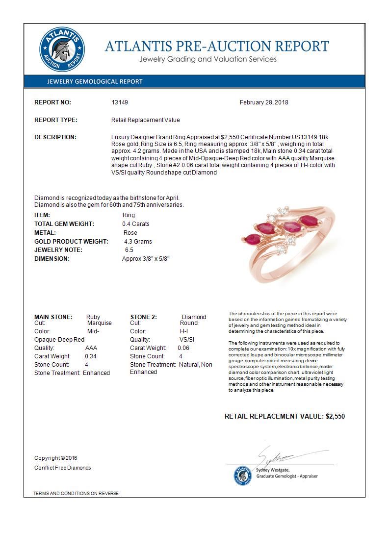REF-38H4A -13149 ---- 0.40 CTW Ruby & Diamond Ring 18K Rose Gold ---- Luxury Designer Brand Ring Appraised at $2,550 Certificate Number US13149 18k Rose gold, Ring Size is 6.5, Ring measuring approx. 3/8" x 5/8" , weighing in total approx. 4.2 grams. Made in the USA and is stamped 18k, Main stone 0.34 carat total weight containing 4 pieces of Mid-Opaque-Deep Red color with AAA quality Marquise shape cut Ruby , Stone #2 0.06 carat total weight containing 4 pieces of H-I color with VS/SI quality Round shape cut Diamond