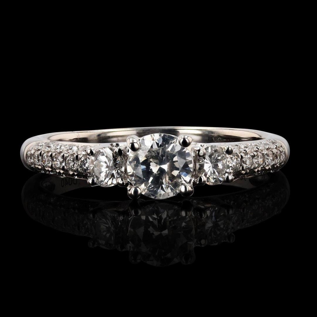 18K Gold Diamond Wing One polished, stamped, and tested 18K white gold ring with a bright finish. The ring is mounted with 1 genuine diamond center stone weighing approximately 0.40 carat, and 34 genuine round diamonds weighing approximately 0.40 carats. This item weighs 2.5 grams, condition is new, excellent workmanship. MAIN GEMSTONE Identity: Natural Diamond Shape: Round Cutting Style: Brilliant Cut Average Diameter: 4.5 Weight: 0.40 carat Color Grade: H Cut Grade: I1 Polish: Very Good Symmetry: Very Good Refractive Index: 2.417 Hardness: 10 ADJACENT GEMSTONES ON RING Identity: Natural Diamond Shape: Round Cutting Style: Brilliant Cut Quantity: 34 Diamonds Measurements: 1.0 - 2.8mm Total Weight: 0.40 carats Color Grade: G - H Clarity Grade: SI1 to SI2 Refractive Index: 2.418 Hardness: 10 CENTER DIAMOND WEIGHT: 0.40ct TOTAL DIAMOND WEIGHT: 0.80ctw WEIGHT OF ITEM: 2.5 grams GOLD CONTENT: 18K White Gold Size: 6 1/4