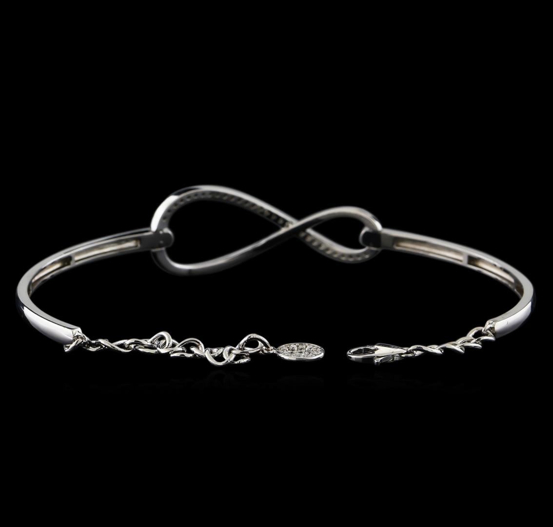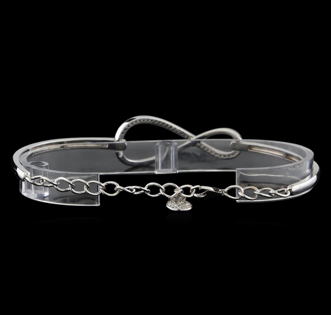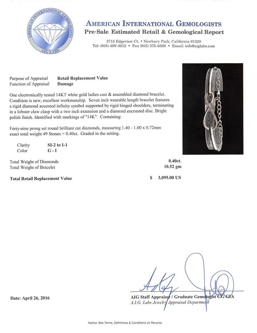 One electronically tested 14KT white gold ladies cast & assembled diamond bracelet. Seven inch wearable length bracelet features a rigid diamond accented infinity symbol supported by rigid hinged shoulders, terminating in a lobster claw clasp with a two inch extension and a diamond encrusted disc. Bright polish finish. Identified with markings of "14K". Condition is new, excellent workmanship. Containing: Forty-Nine prong set round brilliant cut diamonds, measuring 1.40 - 1.00 x 0.72mm exact total weight 49 Stones = 0.40ct. Graded in the setting. Clarity: SI-2 to I-1. Color: G - I. Total Weight of Diamonds 0.40ct. Total Weight of Bracelet 10.52gm. Retail Replacement Value$3,095.00. AIG Appraised at $3,095.00.