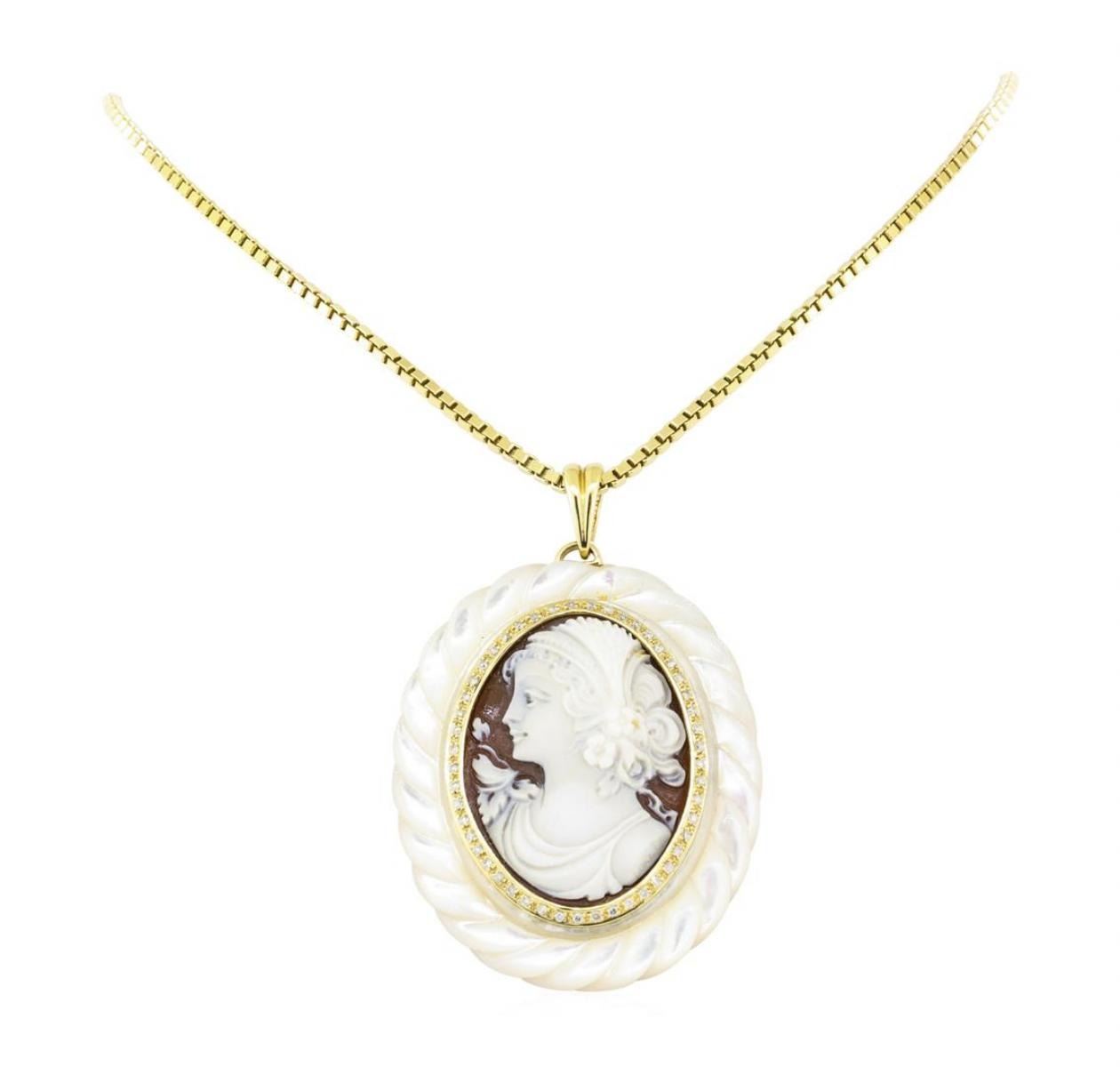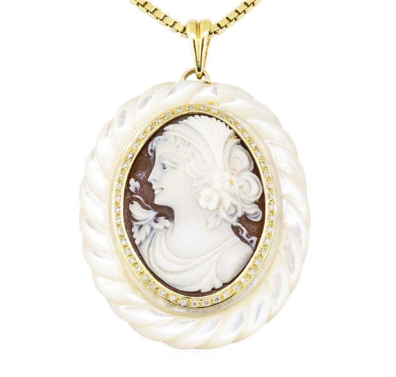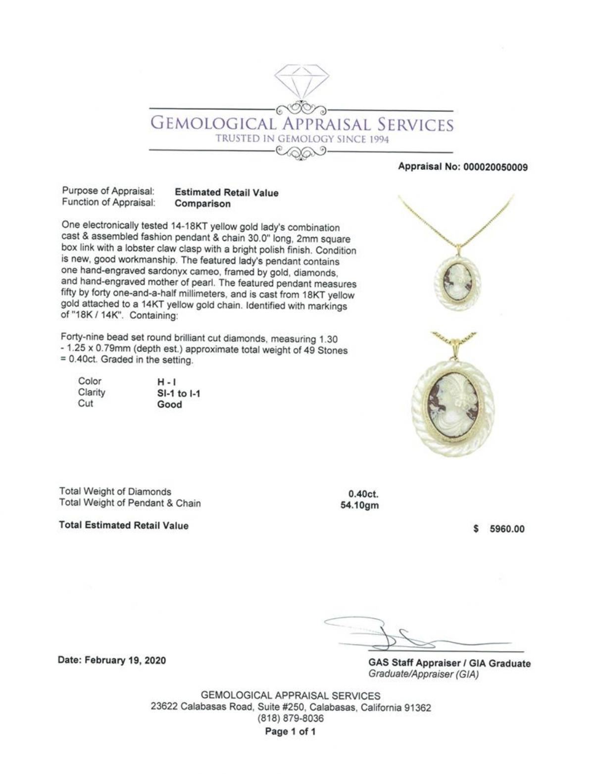 One electronically tested 14-18KT yellow gold lady's combination cast & assembled fashion pendant & chain 30.0' long, 2mm square box link with a lobster claw clasp with a bright polish finish. The featured lady's pendant contains one hand-engraved sardonyx cameo, framed by gold, diamonds, and hand-engraved mother of pearl. The featured pendant measures fifty by forty one-and-a-half millimeters, and is cast from 18KT yellow gold attached to a 14KT yellow gold chain. Identified with markings of '18K / 14K'. Condition is new, good workmanship. Containing: Forty-Nine bead set round brilliant cut diamonds, measuring 1.30 - 1.25 x 0.79mm (depth est.) approximate total weight of 49 Stones = 0.40ct. Graded in the setting. Color H - I Clarity SI-1 to I-1 Cut Good. Total Weight of Diamonds 0.40ct.. Total Weight of Pendant & Chain 54.10gm GAS Appraised at $5960.00. GAS Appraised at $5,960.00.